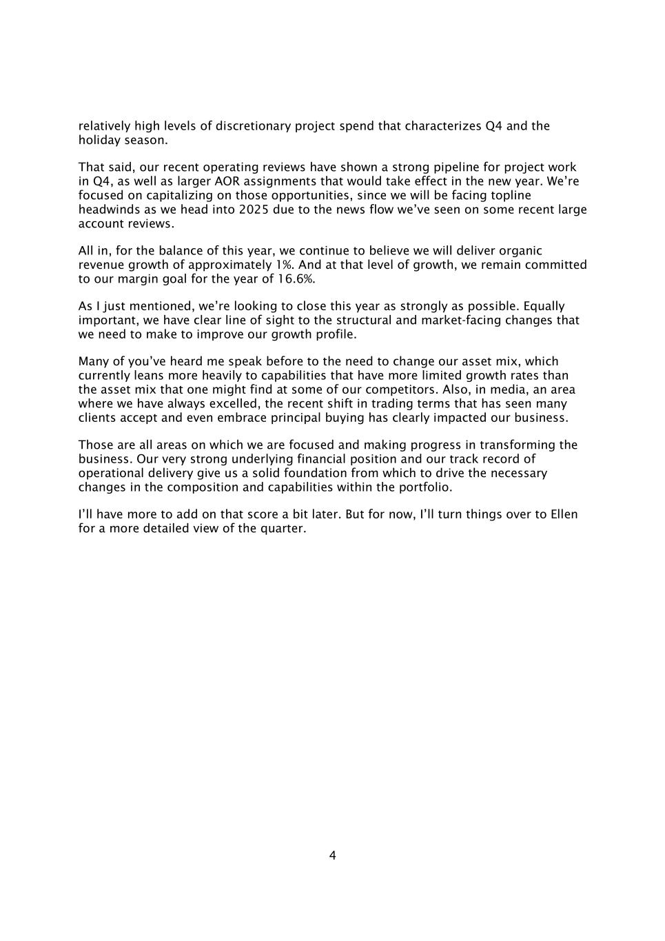 4 relatively high levels of discretionary project spend that characterizes Q4 and the holiday season. That said, our recent operating reviews have shown a strong pipeline for project work in Q4, as well as larger AOR assignments that would take effect in the new year. We’re focused on capitalizing on those opportunities, since we will be facing topline headwinds as we head into 2025 due to the news flow we’ve seen on some recent large account reviews. All in, for the balance of this year, we continue to believe we will deliver organic revenue growth of approximately 1%. And at that level of growth, we remain committed to our margin goal for the year of 16.6%. As I just mentioned, we’re looking to close this year as strongly as possible. Equally important, we have clear line of sight to the structural and market-facing changes that we need to make to improve our growth profile. Many of you’ve heard me speak before to the need to change our asset mix, which currently leans more heavily to capabilities that have more limited growth rates than the asset mix that one might find at some of our competitors. Also, in media, an area where we have always excelled, the recent shift in trading terms that has seen many clients accept and even embrace principal buying has clearly impacted our business. Those are all areas on which we are focused and making progress in transforming the business. Our very strong underlying financial position and our track record of operational delivery give us a solid foundation from which to drive the necessary changes in the composition and capabilities within the portfolio. I’ll have more to add on that score a bit later. But for now, I’ll turn things over to Ellen for a more detailed view of the quarter.