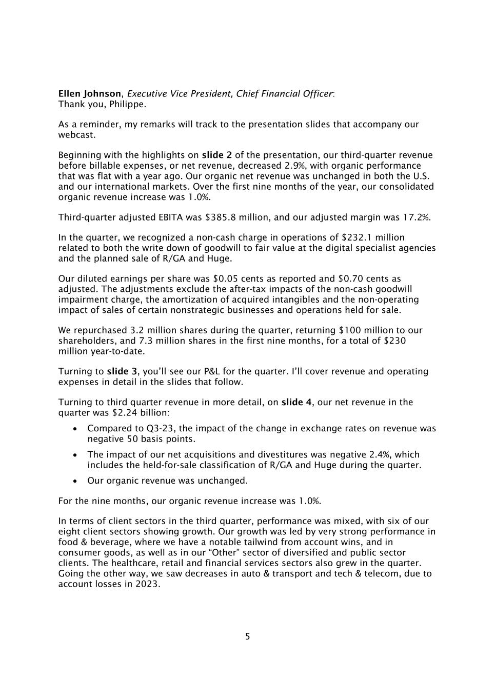 5 Ellen Johnson, Executive Vice President, Chief Financial Officer: Thank you, Philippe. As a reminder, my remarks will track to the presentation slides that accompany our webcast. Beginning with the highlights on slide 2 of the presentation, our third-quarter revenue before billable expenses, or net revenue, decreased 2.9%, with organic performance that was flat with a year ago. Our organic net revenue was unchanged in both the U.S. and our international markets. Over the first nine months of the year, our consolidated organic revenue increase was 1.0%. Third-quarter adjusted EBITA was $385.8 million, and our adjusted margin was 17.2%. In the quarter, we recognized a non-cash charge in operations of $232.1 million related to both the write down of goodwill to fair value at the digital specialist agencies and the planned sale of R/GA and Huge. Our diluted earnings per share was $0.05 cents as reported and $0.70 cents as adjusted. The adjustments exclude the after-tax impacts of the non-cash goodwill impairment charge, the amortization of acquired intangibles and the non-operating impact of sales of certain nonstrategic businesses and operations held for sale. We repurchased 3.2 million shares during the quarter, returning $100 million to our shareholders, and 7.3 million shares in the first nine months, for a total of $230 million year-to-date. Turning to slide 3, you’ll see our P&L for the quarter. I’ll cover revenue and operating expenses in detail in the slides that follow. Turning to third quarter revenue in more detail, on slide 4, our net revenue in the quarter was $2.24 billion:  Compared to Q3-23, the impact of the change in exchange rates on revenue was negative 50 basis points.  The impact of our net acquisitions and divestitures was negative 2.4%, which includes the held-for-sale classification of R/GA and Huge during the quarter.  Our organic revenue was unchanged. For the nine months, our organic revenue increase was 1.0%. In terms of client sectors in the third quarter, performance was mixed, with six of our eight client sectors showing growth. Our growth was led by very strong performance in food & beverage, where we have a notable tailwind from account wins, and in consumer goods, as well as in our “Other” sector of diversified and public sector clients. The healthcare, retail and financial services sectors also grew in the quarter. Going the other way, we saw decreases in auto & transport and tech & telecom, due to account losses in 2023.