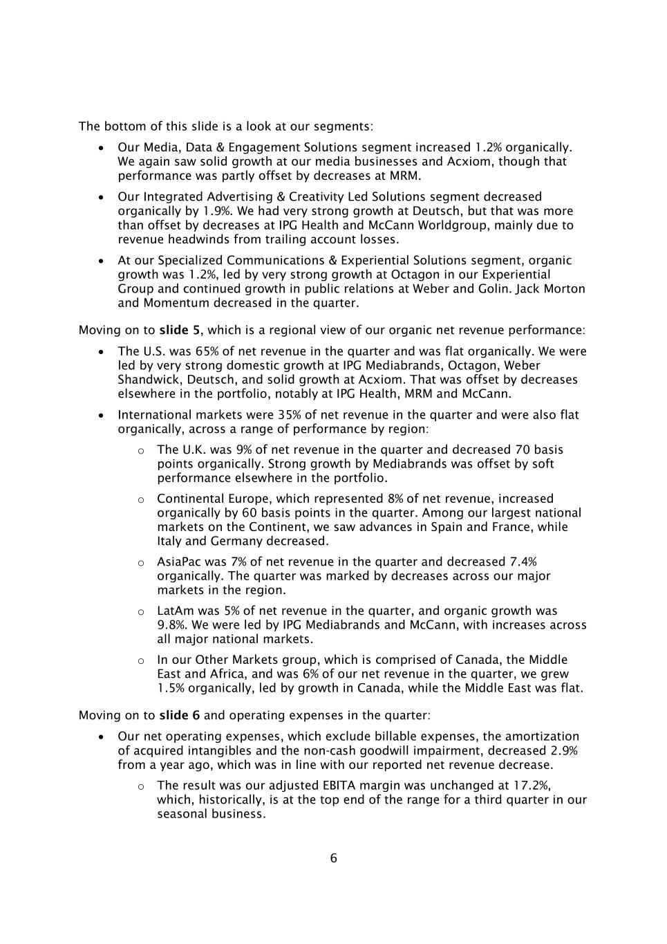 6 The bottom of this slide is a look at our segments:  Our Media, Data & Engagement Solutions segment increased 1.2% organically. We again saw solid growth at our media businesses and Acxiom, though that performance was partly offset by decreases at MRM.  Our Integrated Advertising & Creativity Led Solutions segment decreased organically by 1.9%. We had very strong growth at Deutsch, but that was more than offset by decreases at IPG Health and McCann Worldgroup, mainly due to revenue headwinds from trailing account losses.  At our Specialized Communications & Experiential Solutions segment, organic growth was 1.2%, led by very strong growth at Octagon in our Experiential Group and continued growth in public relations at Weber and Golin. Jack Morton and Momentum decreased in the quarter. Moving on to slide 5, which is a regional view of our organic net revenue performance:  The U.S. was 65% of net revenue in the quarter and was flat organically. We were led by very strong domestic growth at IPG Mediabrands, Octagon, Weber Shandwick, Deutsch, and solid growth at Acxiom. That was offset by decreases elsewhere in the portfolio, notably at IPG Health, MRM and McCann.  International markets were 35% of net revenue in the quarter and were also flat organically, across a range of performance by region: o The U.K. was 9% of net revenue in the quarter and decreased 70 basis points organically. Strong growth by Mediabrands was offset by soft performance elsewhere in the portfolio. o Continental Europe, which represented 8% of net revenue, increased organically by 60 basis points in the quarter. Among our largest national markets on the Continent, we saw advances in Spain and France, while Italy and Germany decreased. o AsiaPac was 7% of net revenue in the quarter and decreased 7.4% organically. The quarter was marked by decreases across our major markets in the region. o LatAm was 5% of net revenue in the quarter, and organic growth was 9.8%. We were led by IPG Mediabrands and McCann, with increases across all major national markets. o In our Other Markets group, which is comprised of Canada, the Middle East and Africa, and was 6% of our net revenue in the quarter, we grew 1.5% organically, led by growth in Canada, while the Middle East was flat. Moving on to slide 6 and operating expenses in the quarter:  Our net operating expenses, which exclude billable expenses, the amortization of acquired intangibles and the non-cash goodwill impairment, decreased 2.9% from a year ago, which was in line with our reported net revenue decrease. o The result was our adjusted EBITA margin was unchanged at 17.2%, which, historically, is at the top end of the range for a third quarter in our seasonal business.