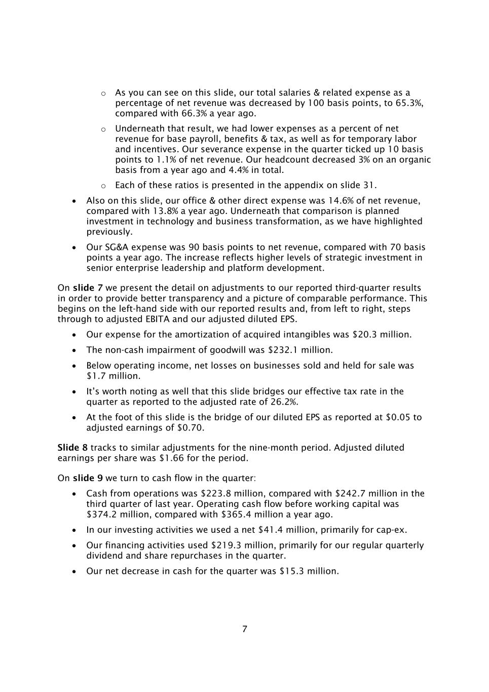 7 o As you can see on this slide, our total salaries & related expense as a percentage of net revenue was decreased by 100 basis points, to 65.3%, compared with 66.3% a year ago. o Underneath that result, we had lower expenses as a percent of net revenue for base payroll, benefits & tax, as well as for temporary labor and incentives. Our severance expense in the quarter ticked up 10 basis points to 1.1% of net revenue. Our headcount decreased 3% on an organic basis from a year ago and 4.4% in total. o Each of these ratios is presented in the appendix on slide 31.  Also on this slide, our office & other direct expense was 14.6% of net revenue, compared with 13.8% a year ago. Underneath that comparison is planned investment in technology and business transformation, as we have highlighted previously.  Our SG&A expense was 90 basis points to net revenue, compared with 70 basis points a year ago. The increase reflects higher levels of strategic investment in senior enterprise leadership and platform development. On slide 7 we present the detail on adjustments to our reported third-quarter results in order to provide better transparency and a picture of comparable performance. This begins on the left-hand side with our reported results and, from left to right, steps through to adjusted EBITA and our adjusted diluted EPS.  Our expense for the amortization of acquired intangibles was $20.3 million.  The non-cash impairment of goodwill was $232.1 million.  Below operating income, net losses on businesses sold and held for sale was $1.7 million.  It’s worth noting as well that this slide bridges our effective tax rate in the quarter as reported to the adjusted rate of 26.2%.  At the foot of this slide is the bridge of our diluted EPS as reported at $0.05 to adjusted earnings of $0.70. Slide 8 tracks to similar adjustments for the nine-month period. Adjusted diluted earnings per share was $1.66 for the period. On slide 9 we turn to cash flow in the quarter:  Cash from operations was $223.8 million, compared with $242.7 million in the third quarter of last year. Operating cash flow before working capital was $374.2 million, compared with $365.4 million a year ago.  In our investing activities we used a net $41.4 million, primarily for cap-ex.  Our financing activities used $219.3 million, primarily for our regular quarterly dividend and share repurchases in the quarter.  Our net decrease in cash for the quarter was $15.3 million.