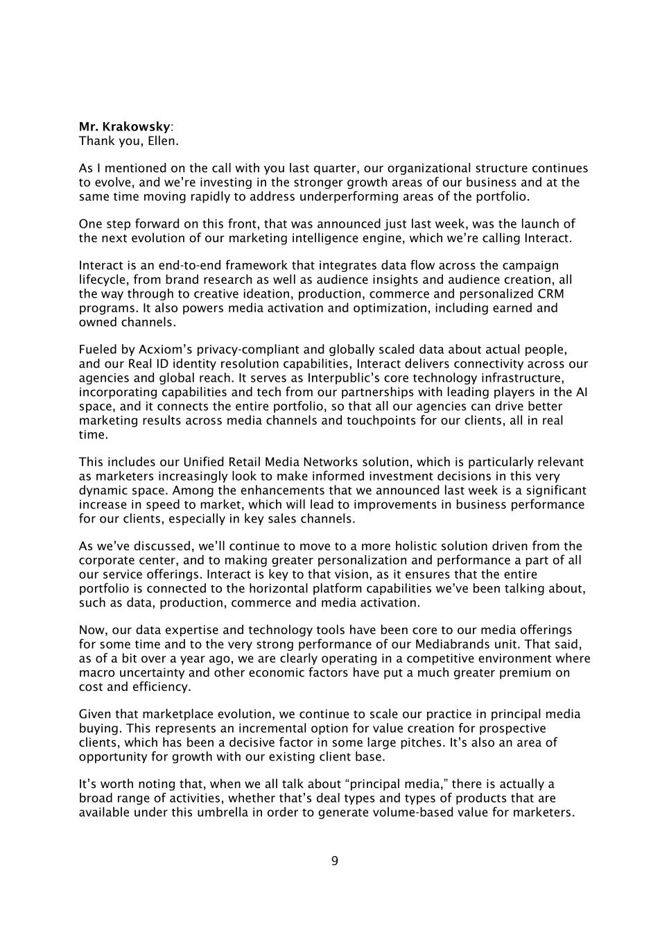 9 Mr. Krakowsky: Thank you, Ellen. As I mentioned on the call with you last quarter, our organizational structure continues to evolve, and we’re investing in the stronger growth areas of our business and at the same time moving rapidly to address underperforming areas of the portfolio. One step forward on this front, that was announced just last week, was the launch of the next evolution of our marketing intelligence engine, which we’re calling Interact. Interact is an end-to-end framework that integrates data flow across the campaign lifecycle, from brand research as well as audience insights and audience creation, all the way through to creative ideation, production, commerce and personalized CRM programs. It also powers media activation and optimization, including earned and owned channels. Fueled by Acxiom’s privacy-compliant and globally scaled data about actual people, and our Real ID identity resolution capabilities, Interact delivers connectivity across our agencies and global reach. It serves as Interpublic’s core technology infrastructure, incorporating capabilities and tech from our partnerships with leading players in the AI space, and it connects the entire portfolio, so that all our agencies can drive better marketing results across media channels and touchpoints for our clients, all in real time. This includes our Unified Retail Media Networks solution, which is particularly relevant as marketers increasingly look to make informed investment decisions in this very dynamic space. Among the enhancements that we announced last week is a significant increase in speed to market, which will lead to improvements in business performance for our clients, especially in key sales channels. As we’ve discussed, we’ll continue to move to a more holistic solution driven from the corporate center, and to making greater personalization and performance a part of all our service offerings. Interact is key to that vision, as it ensures that the entire portfolio is connected to the horizontal platform capabilities we’ve been talking about, such as data, production, commerce and media activation. Now, our data expertise and technology tools have been core to our media offerings for some time and to the very strong performance of our Mediabrands unit. That said, as of a bit over a year ago, we are clearly operating in a competitive environment where macro uncertainty and other economic factors have put a much greater premium on cost and efficiency. Given that marketplace evolution, we continue to scale our practice in principal media buying. This represents an incremental option for value creation for prospective clients, which has been a decisive factor in some large pitches. It’s also an area of opportunity for growth with our existing client base. It’s worth noting that, when we all talk about “principal media,” there is actually a broad range of activities, whether that’s deal types and types of products that are available under this umbrella in order to generate volume-based value for marketers.