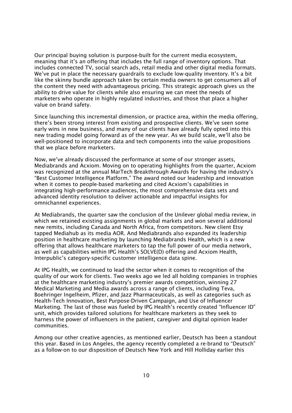10 Our principal buying solution is purpose-built for the current media ecosystem, meaning that it’s an offering that includes the full range of inventory options. That includes connected TV, social search ads, retail media and other digital media formats. We’ve put in place the necessary guardrails to exclude low-quality inventory. It’s a bit like the skinny bundle approach taken by certain media owners to get consumers all of the content they need with advantageous pricing. This strategic approach gives us the ability to drive value for clients while also ensuring we can meet the needs of marketers who operate in highly regulated industries, and those that place a higher value on brand safety. Since launching this incremental dimension, or practice area, within the media offering, there’s been strong interest from existing and prospective clients. We’ve seen some early wins in new business, and many of our clients have already fully opted into this new trading model going forward as of the new year. As we build scale, we’ll also be well-positioned to incorporate data and tech components into the value propositions that we place before marketers. Now, we’ve already discussed the performance at some of our stronger assets, Mediabrands and Acxiom. Moving on to operating highlights from the quarter, Acxiom was recognized at the annual MarTech Breakthrough Awards for having the industry’s “Best Customer Intelligence Platform.” The award noted our leadership and innovation when it comes to people-based marketing and cited Acxiom’s capabilities in integrating high-performance audiences, the most comprehensive data sets and advanced identity resolution to deliver actionable and impactful insights for omnichannel experiences. At Mediabrands, the quarter saw the conclusion of the Unilever global media review, in which we retained existing assignments in global markets and won several additional new remits, including Canada and North Africa, from competitors. New client Etsy tapped Mediahub as its media AOR. And Mediabrands also expanded its leadership position in healthcare marketing by launching Mediabrands Health, which is a new offering that allows healthcare marketers to tap the full power of our media network, as well as capabilities within IPG Health’s SOLVE(D) offering and Acxiom Health, Interpublic’s category-specific customer intelligence data spine. At IPG Health, we continued to lead the sector when it comes to recognition of the quality of our work for clients. Two weeks ago we led all holding companies in trophies at the healthcare marketing industry’s premier awards competition, winning 27 Medical Marketing and Media awards across a range of clients, including Teva, Boehringer Ingelheim, Pfizer, and Jazz Pharmaceuticals, as well as categories such as Health-Tech Innovation, Best Purpose-Driven Campaign, and Use of Influencer Marketing. The last of those was fueled by IPG Health’s recently created “Influencer ID” unit, which provides tailored solutions for healthcare marketers as they seek to harness the power of influencers in the patient, caregiver and digital opinion leader communities. Among our other creative agencies, as mentioned earlier, Deutsch has been a standout this year. Based in Los Angeles, the agency recently completed a re-brand to “Deutsch” as a follow-on to our disposition of Deutsch New York and Hill Holliday earlier this