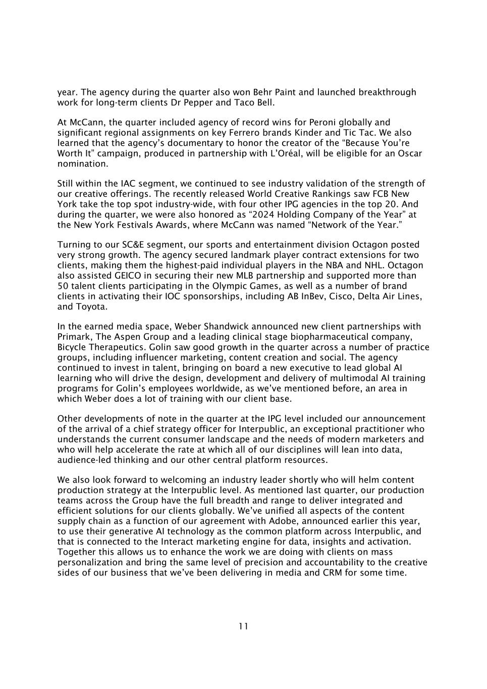 11 year. The agency during the quarter also won Behr Paint and launched breakthrough work for long-term clients Dr Pepper and Taco Bell. At McCann, the quarter included agency of record wins for Peroni globally and significant regional assignments on key Ferrero brands Kinder and Tic Tac. We also learned that the agency’s documentary to honor the creator of the “Because You’re Worth It” campaign, produced in partnership with L’Oréal, will be eligible for an Oscar nomination. Still within the IAC segment, we continued to see industry validation of the strength of our creative offerings. The recently released World Creative Rankings saw FCB New York take the top spot industry-wide, with four other IPG agencies in the top 20. And during the quarter, we were also honored as “2024 Holding Company of the Year” at the New York Festivals Awards, where McCann was named “Network of the Year.” Turning to our SC&E segment, our sports and entertainment division Octagon posted very strong growth. The agency secured landmark player contract extensions for two clients, making them the highest-paid individual players in the NBA and NHL. Octagon also assisted GEICO in securing their new MLB partnership and supported more than 50 talent clients participating in the Olympic Games, as well as a number of brand clients in activating their IOC sponsorships, including AB InBev, Cisco, Delta Air Lines, and Toyota. In the earned media space, Weber Shandwick announced new client partnerships with Primark, The Aspen Group and a leading clinical stage biopharmaceutical company, Bicycle Therapeutics. Golin saw good growth in the quarter across a number of practice groups, including influencer marketing, content creation and social. The agency continued to invest in talent, bringing on board a new executive to lead global AI learning who will drive the design, development and delivery of multimodal AI training programs for Golin’s employees worldwide, as we’ve mentioned before, an area in which Weber does a lot of training with our client base. Other developments of note in the quarter at the IPG level included our announcement of the arrival of a chief strategy officer for Interpublic, an exceptional practitioner who understands the current consumer landscape and the needs of modern marketers and who will help accelerate the rate at which all of our disciplines will lean into data, audience-led thinking and our other central platform resources. We also look forward to welcoming an industry leader shortly who will helm content production strategy at the Interpublic level. As mentioned last quarter, our production teams across the Group have the full breadth and range to deliver integrated and efficient solutions for our clients globally. We’ve unified all aspects of the content supply chain as a function of our agreement with Adobe, announced earlier this year, to use their generative AI technology as the common platform across Interpublic, and that is connected to the Interact marketing engine for data, insights and activation. Together this allows us to enhance the work we are doing with clients on mass personalization and bring the same level of precision and accountability to the creative sides of our business that we’ve been delivering in media and CRM for some time.