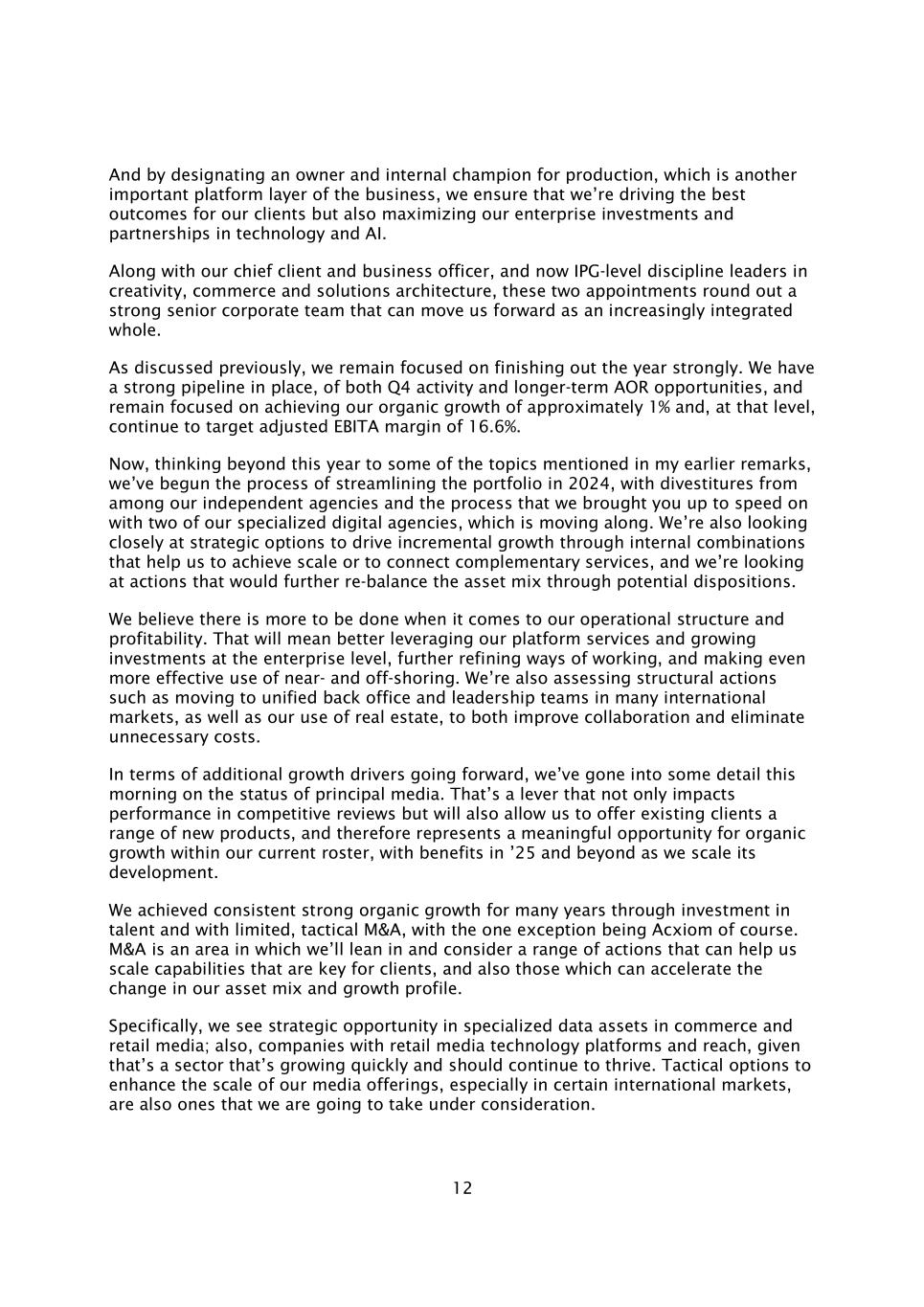 12 And by designating an owner and internal champion for production, which is another important platform layer of the business, we ensure that we’re driving the best outcomes for our clients but also maximizing our enterprise investments and partnerships in technology and AI. Along with our chief client and business officer, and now IPG-level discipline leaders in creativity, commerce and solutions architecture, these two appointments round out a strong senior corporate team that can move us forward as an increasingly integrated whole. As discussed previously, we remain focused on finishing out the year strongly. We have a strong pipeline in place, of both Q4 activity and longer-term AOR opportunities, and remain focused on achieving our organic growth of approximately 1% and, at that level, continue to target adjusted EBITA margin of 16.6%. Now, thinking beyond this year to some of the topics mentioned in my earlier remarks, we’ve begun the process of streamlining the portfolio in 2024, with divestitures from among our independent agencies and the process that we brought you up to speed on with two of our specialized digital agencies, which is moving along. We’re also looking closely at strategic options to drive incremental growth through internal combinations that help us to achieve scale or to connect complementary services, and we’re looking at actions that would further re-balance the asset mix through potential dispositions. We believe there is more to be done when it comes to our operational structure and profitability. That will mean better leveraging our platform services and growing investments at the enterprise level, further refining ways of working, and making even more effective use of near- and off-shoring. We’re also assessing structural actions such as moving to unified back office and leadership teams in many international markets, as well as our use of real estate, to both improve collaboration and eliminate unnecessary costs. In terms of additional growth drivers going forward, we’ve gone into some detail this morning on the status of principal media. That’s a lever that not only impacts performance in competitive reviews but will also allow us to offer existing clients a range of new products, and therefore represents a meaningful opportunity for organic growth within our current roster, with benefits in ’25 and beyond as we scale its development. We achieved consistent strong organic growth for many years through investment in talent and with limited, tactical M&A, with the one exception being Acxiom of course. M&A is an area in which we’ll lean in and consider a range of actions that can help us scale capabilities that are key for clients, and also those which can accelerate the change in our asset mix and growth profile. Specifically, we see strategic opportunity in specialized data assets in commerce and retail media; also, companies with retail media technology platforms and reach, given that’s a sector that’s growing quickly and should continue to thrive. Tactical options to enhance the scale of our media offerings, especially in certain international markets, are also ones that we are going to take under consideration.
