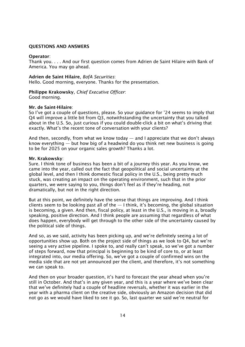 14 QUESTIONS AND ANSWERS Operator: Thank you. . . . And our first question comes from Adrien de Saint Hilaire with Bank of America. You may go ahead. Adrien de Saint Hilaire, BofA Securities: Hello. Good morning, everyone. Thanks for the presentation. Philippe Krakowsky, Chief Executive Officer: Good morning. Mr. de Saint-Hilaire: So I’ve got a couple of questions, please. So your guidance for ’24 seems to imply that Q4 will improve a little bit from Q3, notwithstanding the uncertainty that you talked about in the U.S. So, just curious if you could double-click a bit on what’s driving that exactly. What’s the recent tone of conversation with your clients? And then, secondly, from what we know today — and I appreciate that we don’t always know everything — but how big of a headwind do you think net new business is going to be for 2025 on your organic sales growth? Thanks a lot. Mr. Krakowsky: Sure. I think tone of business has been a bit of a journey this year. As you know, we came into the year, called out the fact that geopolitical and social uncertainty at the global level, and then I think domestic fiscal policy in the U.S., being pretty much stuck, was creating an impact on the operating environment, such that in the prior quarters, we were saying to you, things don’t feel as if they’re heading, not dramatically, but not in the right direction. But at this point, we definitely have the sense that things are improving. And I think clients seem to be looking past all of the — I think, it’s becoming, the global situation is becoming, a given. And then, fiscal policy, at least in the U.S., is moving in a, broadly speaking, positive direction. And I think people are assuming that regardless of what does happen, everybody will get through to the other side of the uncertainty caused by the political side of things. And so, as we said, activity has been picking up, and we’re definitely seeing a lot of opportunities show up. Both on the project side of things as we look to Q4, but we’re seeing a very active pipeline. I spoke to, and really can’t speak, so we’ve got a number of steps forward, now that principal is beginning to be kind of core to, or at least integrated into, our media offering. So, we’ve got a couple of confirmed wins on the media side that are not yet announced per the client, and therefore, it’s not something we can speak to. And then on your broader question, it’s hard to forecast the year ahead when you’re still in October. And that’s in any given year, and this is a year where we’ve been clear that we’ve definitely had a couple of headline reversals, whether it was earlier in the year with a pharma client on the creative side, obviously an Amazon decision that did not go as we would have liked to see it go. So, last quarter we said we’re neutral for