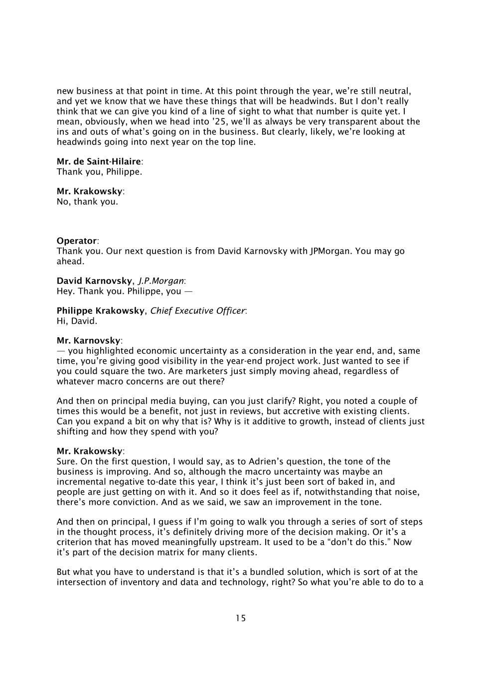 15 new business at that point in time. At this point through the year, we’re still neutral, and yet we know that we have these things that will be headwinds. But I don’t really think that we can give you kind of a line of sight to what that number is quite yet. I mean, obviously, when we head into ’25, we’ll as always be very transparent about the ins and outs of what’s going on in the business. But clearly, likely, we’re looking at headwinds going into next year on the top line. Mr. de Saint-Hilaire: Thank you, Philippe. Mr. Krakowsky: No, thank you. Operator: Thank you. Our next question is from David Karnovsky with JPMorgan. You may go ahead. David Karnovsky, J.P.Morgan: Hey. Thank you. Philippe, you — Philippe Krakowsky, Chief Executive Officer: Hi, David. Mr. Karnovsky: — you highlighted economic uncertainty as a consideration in the year end, and, same time, you’re giving good visibility in the year-end project work. Just wanted to see if you could square the two. Are marketers just simply moving ahead, regardless of whatever macro concerns are out there? And then on principal media buying, can you just clarify? Right, you noted a couple of times this would be a benefit, not just in reviews, but accretive with existing clients. Can you expand a bit on why that is? Why is it additive to growth, instead of clients just shifting and how they spend with you? Mr. Krakowsky: Sure. On the first question, I would say, as to Adrien’s question, the tone of the business is improving. And so, although the macro uncertainty was maybe an incremental negative to-date this year, I think it’s just been sort of baked in, and people are just getting on with it. And so it does feel as if, notwithstanding that noise, there’s more conviction. And as we said, we saw an improvement in the tone. And then on principal, I guess if I’m going to walk you through a series of sort of steps in the thought process, it’s definitely driving more of the decision making. Or it’s a criterion that has moved meaningfully upstream. It used to be a “don’t do this.” Now it’s part of the decision matrix for many clients. But what you have to understand is that it’s a bundled solution, which is sort of at the intersection of inventory and data and technology, right? So what you’re able to do to a