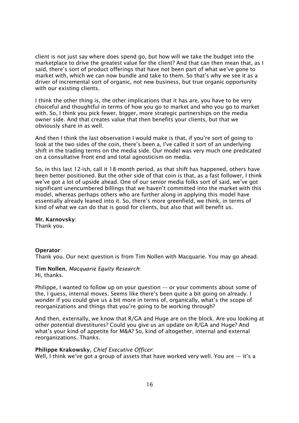 16 client is not just say where does spend go, but how will we take the budget into the marketplace to drive the greatest value for the client? And that can then mean that, as I said, there’s sort of product offerings that have not been part of what we’ve gone to market with, which we can now bundle and take to them. So that’s why we see it as a driver of incremental sort of organic, not new business, but true organic opportunity with our existing clients. I think the other thing is, the other implications that it has are, you have to be very choiceful and thoughtful in terms of how you go to market and who you go to market with. So, I think you pick fewer, bigger, more strategic partnerships on the media owner side. And that creates value that then benefits your clients, but that we obviously share in as well. And then I think the last observation I would make is that, if you’re sort of going to look at the two sides of the coin, there’s been a, I’ve called it sort of an underlying shift in the trading terms on the media side. Our model was very much one predicated on a consultative front end and total agnosticism on media. So, in this last 12-ish, call it 18-month period, as that shift has happened, others have been better positioned. But the other side of that coin is that, as a fast follower, I think we’ve got a lot of upside ahead. One of our senior media folks sort of said, we’ve got significant unencumbered billings that we haven’t committed into the market with this model, whereas perhaps others who are further along in applying this model have essentially already leaned into it. So, there’s more greenfield, we think, in terms of kind of what we can do that is good for clients, but also that will benefit us. Mr. Karnovsky: Thank you. Operator: Thank you. Our next question is from Tim Nollen with Macquarie. You may go ahead. Tim Nollen, Macquarie Equity Research: Hi, thanks. Philippe, I wanted to follow up on your question — or your comments about some of the, I guess, internal moves. Seems like there’s been quite a bit going on already. I wonder if you could give us a bit more in terms of, organically, what’s the scope of reorganizations and things that you’re going to be working through? And then, externally, we know that R/GA and Huge are on the block. Are you looking at other potential divestitures? Could you give us an update on R/GA and Huge? And what’s your kind of appetite for M&A? So, kind of altogether, internal and external reorganizations. Thanks. Philippe Krakowsky, Chief Executive Officer: Well, I think we’ve got a group of assets that have worked very well. You are — it’s a