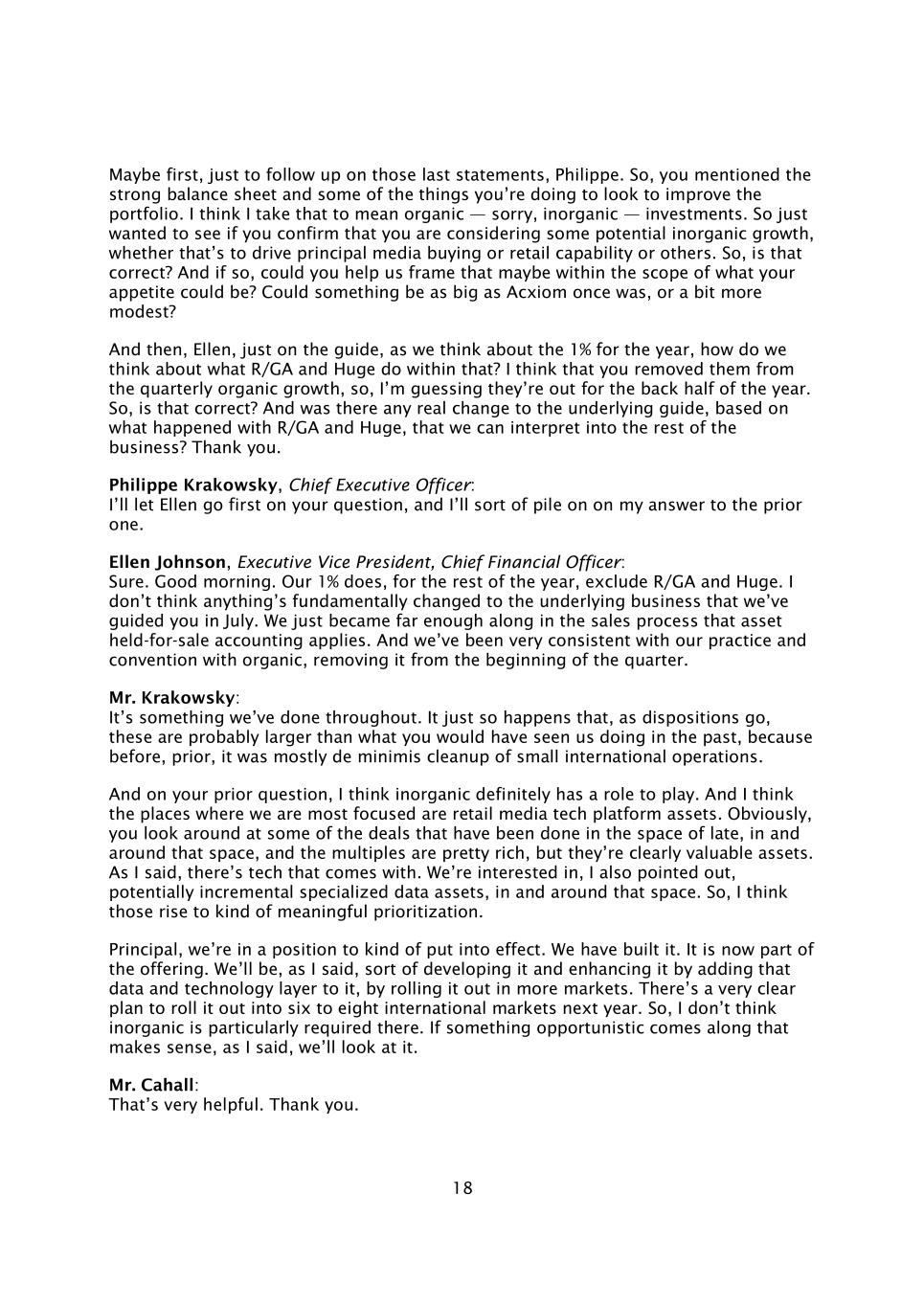 18 Maybe first, just to follow up on those last statements, Philippe. So, you mentioned the strong balance sheet and some of the things you’re doing to look to improve the portfolio. I think I take that to mean organic — sorry, inorganic — investments. So just wanted to see if you confirm that you are considering some potential inorganic growth, whether that’s to drive principal media buying or retail capability or others. So, is that correct? And if so, could you help us frame that maybe within the scope of what your appetite could be? Could something be as big as Acxiom once was, or a bit more modest? And then, Ellen, just on the guide, as we think about the 1% for the year, how do we think about what R/GA and Huge do within that? I think that you removed them from the quarterly organic growth, so, I’m guessing they’re out for the back half of the year. So, is that correct? And was there any real change to the underlying guide, based on what happened with R/GA and Huge, that we can interpret into the rest of the business? Thank you. Philippe Krakowsky, Chief Executive Officer: I’ll let Ellen go first on your question, and I’ll sort of pile on on my answer to the prior one. Ellen Johnson, Executive Vice President, Chief Financial Officer: Sure. Good morning. Our 1% does, for the rest of the year, exclude R/GA and Huge. I don’t think anything’s fundamentally changed to the underlying business that we’ve guided you in July. We just became far enough along in the sales process that asset held-for-sale accounting applies. And we’ve been very consistent with our practice and convention with organic, removing it from the beginning of the quarter. Mr. Krakowsky: It’s something we’ve done throughout. It just so happens that, as dispositions go, these are probably larger than what you would have seen us doing in the past, because before, prior, it was mostly de minimis cleanup of small international operations. And on your prior question, I think inorganic definitely has a role to play. And I think the places where we are most focused are retail media tech platform assets. Obviously, you look around at some of the deals that have been done in the space of late, in and around that space, and the multiples are pretty rich, but they’re clearly valuable assets. As I said, there’s tech that comes with. We’re interested in, I also pointed out, potentially incremental specialized data assets, in and around that space. So, I think those rise to kind of meaningful prioritization. Principal, we’re in a position to kind of put into effect. We have built it. It is now part of the offering. We’ll be, as I said, sort of developing it and enhancing it by adding that data and technology layer to it, by rolling it out in more markets. There’s a very clear plan to roll it out into six to eight international markets next year. So, I don’t think inorganic is particularly required there. If something opportunistic comes along that makes sense, as I said, we’ll look at it. Mr. Cahall: That’s very helpful. Thank you.