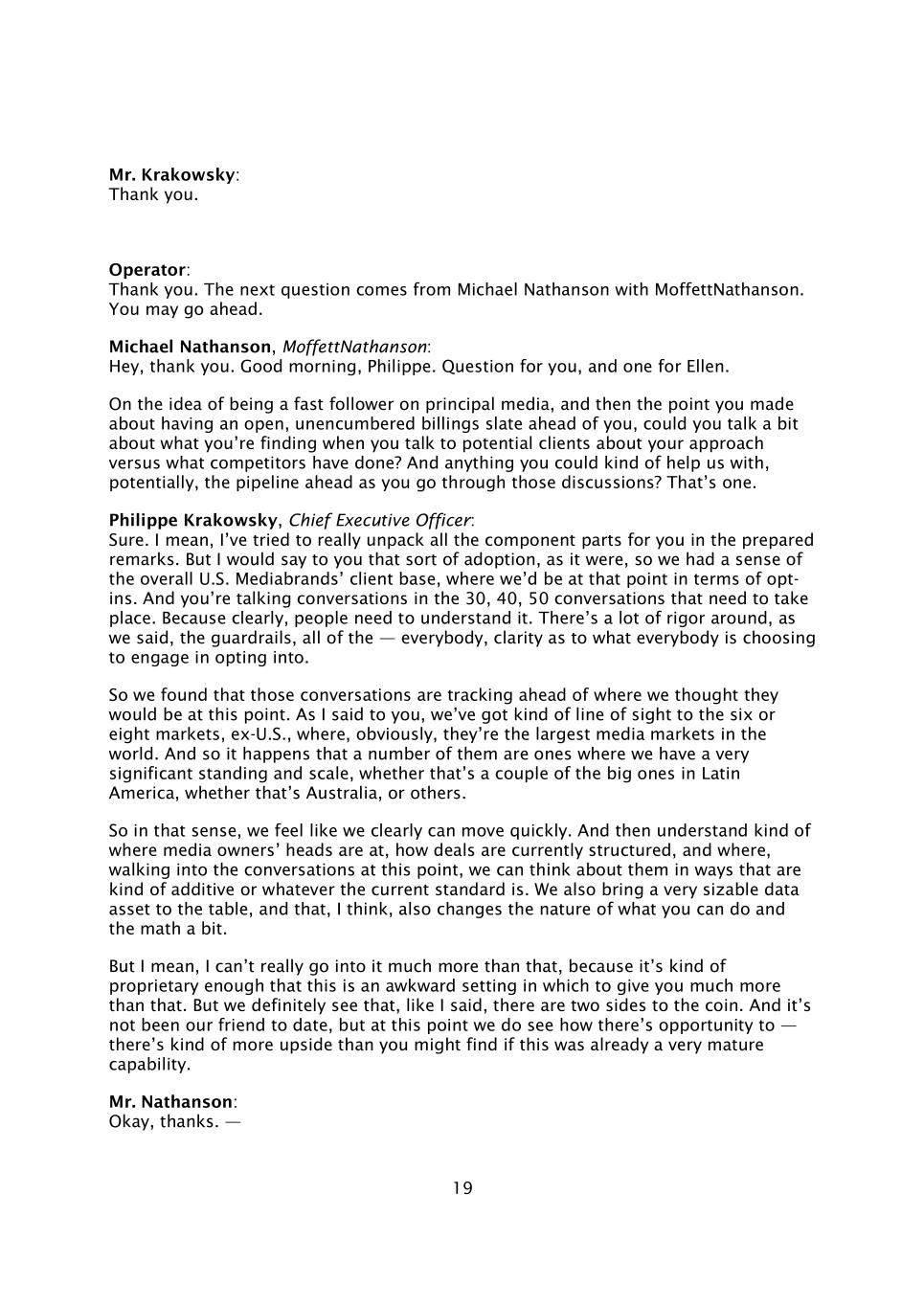 19 Mr. Krakowsky: Thank you. Operator: Thank you. The next question comes from Michael Nathanson with MoffettNathanson. You may go ahead. Michael Nathanson, MoffettNathanson: Hey, thank you. Good morning, Philippe. Question for you, and one for Ellen. On the idea of being a fast follower on principal media, and then the point you made about having an open, unencumbered billings slate ahead of you, could you talk a bit about what you’re finding when you talk to potential clients about your approach versus what competitors have done? And anything you could kind of help us with, potentially, the pipeline ahead as you go through those discussions? That’s one. Philippe Krakowsky, Chief Executive Officer: Sure. I mean, I’ve tried to really unpack all the component parts for you in the prepared remarks. But I would say to you that sort of adoption, as it were, so we had a sense of the overall U.S. Mediabrands’ client base, where we’d be at that point in terms of opt- ins. And you’re talking conversations in the 30, 40, 50 conversations that need to take place. Because clearly, people need to understand it. There’s a lot of rigor around, as we said, the guardrails, all of the — everybody, clarity as to what everybody is choosing to engage in opting into. So we found that those conversations are tracking ahead of where we thought they would be at this point. As I said to you, we’ve got kind of line of sight to the six or eight markets, ex-U.S., where, obviously, they’re the largest media markets in the world. And so it happens that a number of them are ones where we have a very significant standing and scale, whether that’s a couple of the big ones in Latin America, whether that’s Australia, or others. So in that sense, we feel like we clearly can move quickly. And then understand kind of where media owners’ heads are at, how deals are currently structured, and where, walking into the conversations at this point, we can think about them in ways that are kind of additive or whatever the current standard is. We also bring a very sizable data asset to the table, and that, I think, also changes the nature of what you can do and the math a bit. But I mean, I can’t really go into it much more than that, because it’s kind of proprietary enough that this is an awkward setting in which to give you much more than that. But we definitely see that, like I said, there are two sides to the coin. And it’s not been our friend to date, but at this point we do see how there’s opportunity to — there’s kind of more upside than you might find if this was already a very mature capability. Mr. Nathanson: Okay, thanks. —