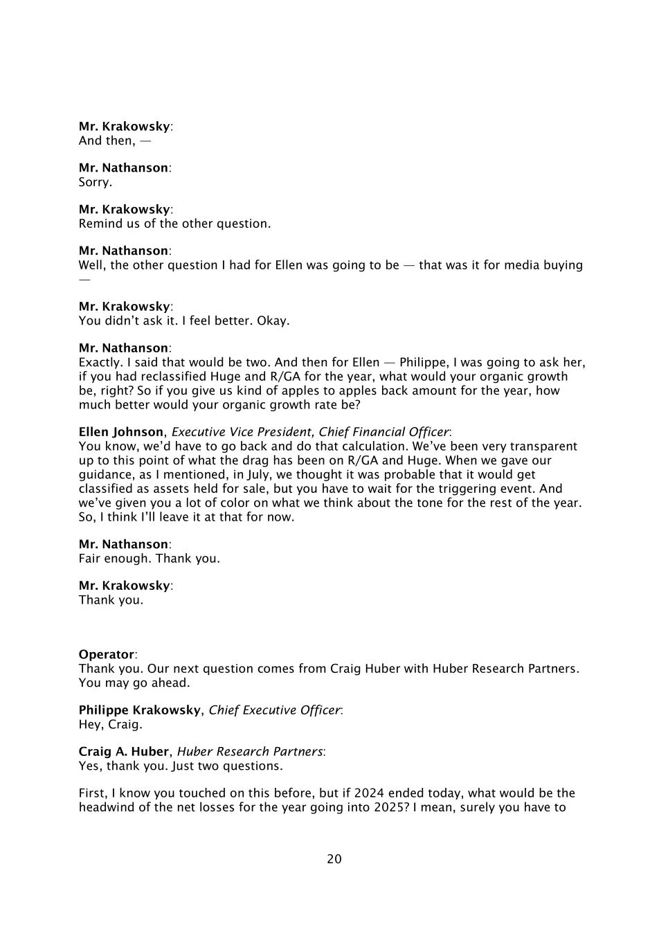 20 Mr. Krakowsky: And then, — Mr. Nathanson: Sorry. Mr. Krakowsky: Remind us of the other question. Mr. Nathanson: Well, the other question I had for Ellen was going to be — that was it for media buying — Mr. Krakowsky: You didn’t ask it. I feel better. Okay. Mr. Nathanson: Exactly. I said that would be two. And then for Ellen — Philippe, I was going to ask her, if you had reclassified Huge and R/GA for the year, what would your organic growth be, right? So if you give us kind of apples to apples back amount for the year, how much better would your organic growth rate be? Ellen Johnson, Executive Vice President, Chief Financial Officer: You know, we’d have to go back and do that calculation. We’ve been very transparent up to this point of what the drag has been on R/GA and Huge. When we gave our guidance, as I mentioned, in July, we thought it was probable that it would get classified as assets held for sale, but you have to wait for the triggering event. And we’ve given you a lot of color on what we think about the tone for the rest of the year. So, I think I’ll leave it at that for now. Mr. Nathanson: Fair enough. Thank you. Mr. Krakowsky: Thank you. Operator: Thank you. Our next question comes from Craig Huber with Huber Research Partners. You may go ahead. Philippe Krakowsky, Chief Executive Officer: Hey, Craig. Craig A. Huber, Huber Research Partners: Yes, thank you. Just two questions. First, I know you touched on this before, but if 2024 ended today, what would be the headwind of the net losses for the year going into 2025? I mean, surely you have to