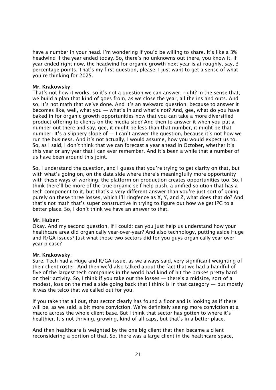 21 have a number in your head. I’m wondering if you’d be willing to share. It’s like a 3% headwind if the year ended today. So, there’s no unknowns out there, you know it, if year ended right now, the headwind for organic growth next year is at roughly, say, 3 percentage points. That’s my first question, please. I just want to get a sense of what you’re thinking for 2025. Mr. Krakowsky: That’s not how it works, so it’s not a question we can answer, right? In the sense that, we build a plan that kind of goes from, as we close the year, all the ins and outs. And so, it’s not math that we’ve done. And it’s an awkward question, because to answer it becomes like, well, what you — what’s in and what’s not? And, gee, what do you have baked in for organic growth opportunities now that you can take a more diversified product offering to clients on the media side? And then to answer it when you put a number out there and say, gee, it might be less than that number, it might be that number. It’s a slippery slope of — I can’t answer the question, because it’s not how we run the business. And it’s not actually, I would assume, how you would expect us to. So, as I said, I don’t think that we can forecast a year ahead in October, whether it’s this year or any year that I can ever remember. And it’s been a while that a number of us have been around this joint. So, I understand the question, and I guess that you’re trying to get clarity on that, but with what’s going on, on the data side where there’s meaningfully more opportunity with these ways of working; the platform on production creates opportunities too. So, I think there’ll be more of the true organic self-help push, a unified solution that has a tech component to it, but that’s a very different answer than you’re just sort of going purely on these three losses, which I’ll ringfence as X, Y, and Z, what does that do? And that’s not math that’s super constructive in trying to figure out how we get IPG to a better place. So, I don’t think we have an answer to that. Mr. Huber: Okay. And my second question, if I could: can you just help us understand how your healthcare area did organically year-over-year? And also technology, putting aside Huge and R/GA issues? Just what those two sectors did for you guys organically year-over- year please? Mr. Krakowsky: Sure. Tech had a Huge and R/GA issue, as we always said, very significant weighting of their client roster. And then we’d also talked about the fact that we had a handful of five of the largest tech companies in the world had kind of hit the brakes pretty hard on their activity. So, I think if you take out the losses — there’s a midsize, sort of a modest, loss on the media side going back that I think is in that category — but mostly it was the telco that we called out for you. If you take that all out, that sector clearly has found a floor and is looking as if there will be, as we said, a bit more conviction. We’re definitely seeing more conviction at a macro across the whole client base. But I think that sector has gotten to where it’s healthier. It’s not thriving, growing, kind of all caps, but that’s in a better place. And then healthcare is weighted by the one big client that then became a client reconsidering a portion of that. So, there was a large client in the healthcare space,