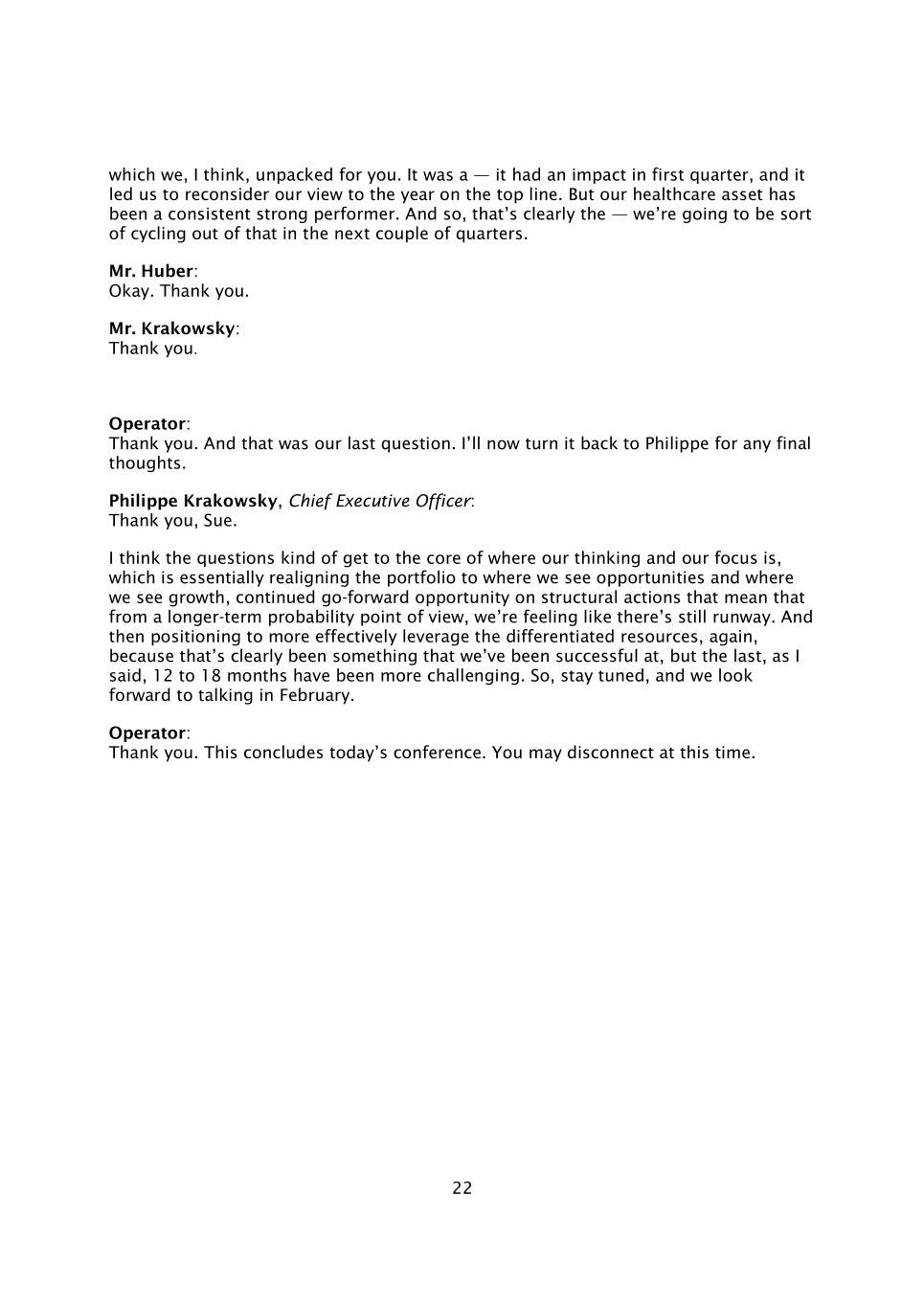 22 which we, I think, unpacked for you. It was a — it had an impact in first quarter, and it led us to reconsider our view to the year on the top line. But our healthcare asset has been a consistent strong performer. And so, that’s clearly the — we’re going to be sort of cycling out of that in the next couple of quarters. Mr. Huber: Okay. Thank you. Mr. Krakowsky: Thank you. Operator: Thank you. And that was our last question. I’ll now turn it back to Philippe for any final thoughts. Philippe Krakowsky, Chief Executive Officer: Thank you, Sue. I think the questions kind of get to the core of where our thinking and our focus is, which is essentially realigning the portfolio to where we see opportunities and where we see growth, continued go-forward opportunity on structural actions that mean that from a longer-term probability point of view, we’re feeling like there’s still runway. And then positioning to more effectively leverage the differentiated resources, again, because that’s clearly been something that we’ve been successful at, but the last, as I said, 12 to 18 months have been more challenging. So, stay tuned, and we look forward to talking in February. Operator: Thank you. This concludes today’s conference. You may disconnect at this time.