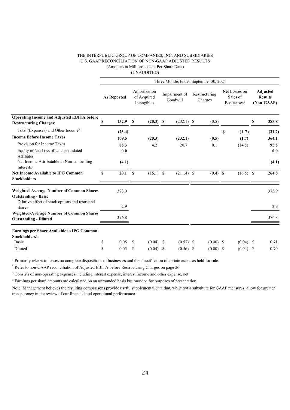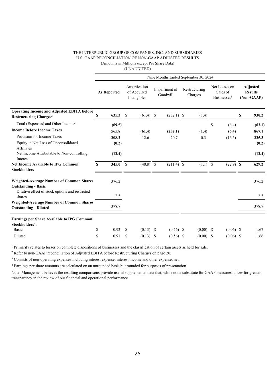 24 THE INTERPUBLIC GROUP OF COMPANIES, INC. AND SUBSIDIARIES U.S. GAAP RECONCILIATION OF NON-GAAP ADJUSTED RESULTS (Amounts in Millions except Per Share Data) (UNAUDITED) Three Months Ended September 30, 2024 As Reported Amortization of Acquired Intangibles Impairment of Goodwill Restructuring Charges Net Losses on Sales of Businesses1 Adjusted Results (Non-GAAP) Operating Income and Adjusted EBITA before Restructuring Charges2 $ 132.9 $ (20.3) $ (232.1) $ (0.5) $ 385.8 Total (Expenses) and Other Income3 (23.4) $ (1.7) (21.7) Income Before Income Taxes 109.5 (20.3) (232.1) (0.5) (1.7) 364.1 Provision for Income Taxes 85.3 4.2 20.7 0.1 (14.8) 95.5 Equity in Net Loss of Unconsolidated Affiliates 0.0 0.0 Net Income Attributable to Non-controlling Interests (4.1) (4.1) Net Income Available to IPG Common Stockholders $ 20.1 $ (16.1) $ (211.4) $ (0.4) $ (16.5) $ 264.5 Weighted-Average Number of Common Shares Outstanding - Basic 373.9 373.9 Dilutive effect of stock options and restricted shares 2.9 2.9 Weighted-Average Number of Common Shares Outstanding - Diluted 376.8 376.8 Earnings per Share Available to IPG Common Stockholders4: Basic $ 0.05 $ (0.04) $ (0.57) $ (0.00) $ (0.04) $ 0.71 Diluted $ 0.05 $ (0.04) $ (0.56) $ (0.00) $ (0.04) $ 0.70 1 Primarily relates to losses on complete dispositions of businesses and the classification of certain assets as held for sale. 2 Refer to non-GAAP reconciliation of Adjusted EBITA before Restructuring Charges on page 26. 3 Consists of non-operating expenses including interest expense, interest income and other expense, net. 4 Earnings per share amounts are calculated on an unrounded basis but rounded for purposes of presentation. Note: Management believes the resulting comparisons provide useful supplemental data that, while not a substitute for GAAP measures, allow for greater transparency in the review of our financial and operational performance.