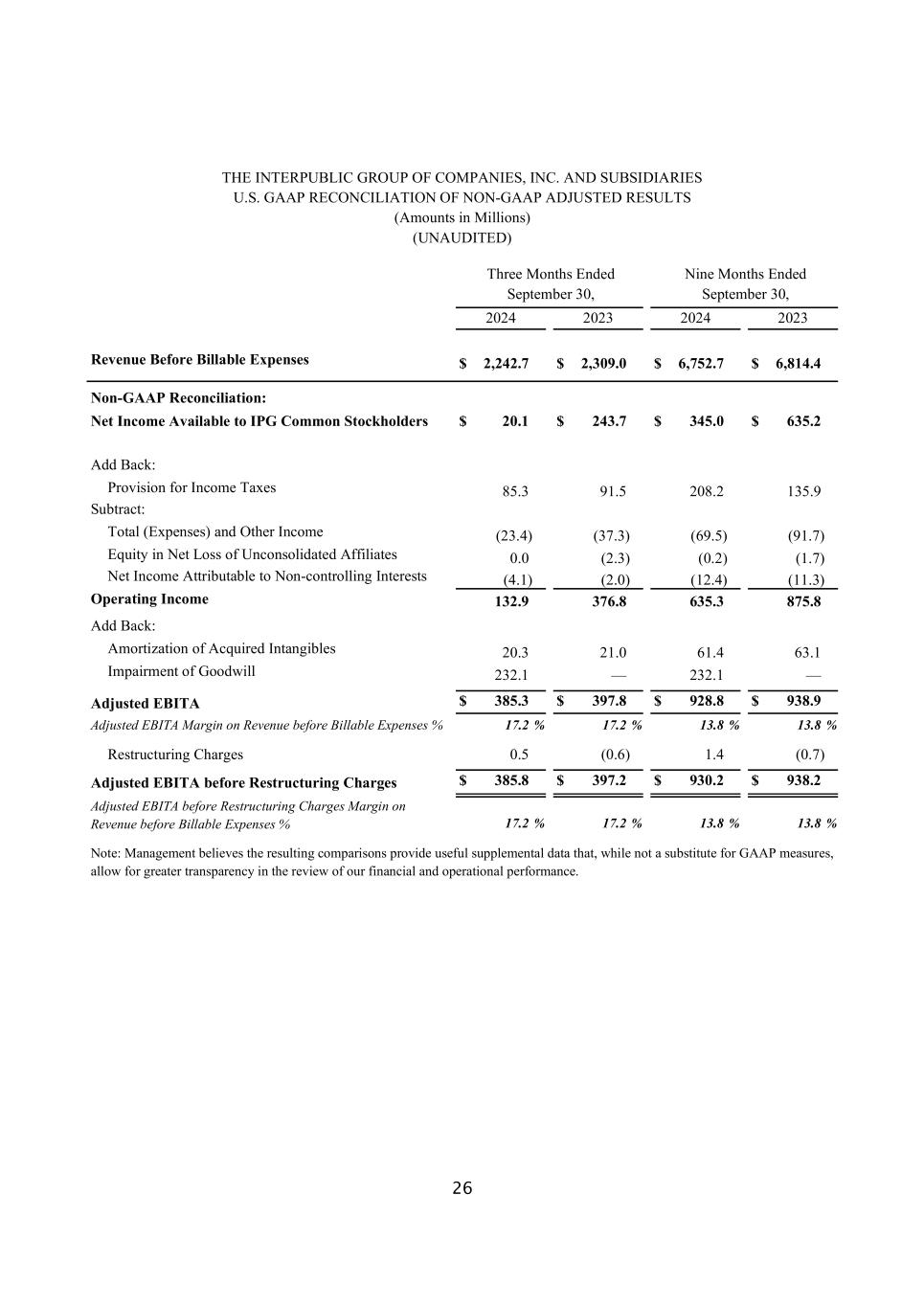 26 THE INTERPUBLIC GROUP OF COMPANIES, INC. AND SUBSIDIARIES U.S. GAAP RECONCILIATION OF NON-GAAP ADJUSTED RESULTS (Amounts in Millions) (UNAUDITED) Three Months Ended September 30, Nine Months Ended September 30, 2024 2023 2024 2023 Revenue Before Billable Expenses $ 2,242.7 $ 2,309.0 $ 6,752.7 $ 6,814.4 Non-GAAP Reconciliation: Net Income Available to IPG Common Stockholders $ 20.1 $ 243.7 $ 345.0 $ 635.2 Add Back: Provision for Income Taxes 85.3 91.5 208.2 135.9 Subtract: Total (Expenses) and Other Income (23.4) (37.3) (69.5) (91.7) Equity in Net Loss of Unconsolidated Affiliates 0.0 (2.3) (0.2) (1.7) Net Income Attributable to Non-controlling Interests (4.1) (2.0) (12.4) (11.3) Operating Income 132.9 376.8 635.3 875.8 Add Back: Amortization of Acquired Intangibles 20.3 21.0 61.4 63.1 Impairment of Goodwill 232.1 — 232.1 — Adjusted EBITA $ 385.3 $ 397.8 $ 928.8 $ 938.9 Adjusted EBITA Margin on Revenue before Billable Expenses % 17.2 % 17.2 % 13.8 % 13.8 % Restructuring Charges 0.5 (0.6) 1.4 (0.7) Adjusted EBITA before Restructuring Charges $ 385.8 $ 397.2 $ 930.2 $ 938.2 Adjusted EBITA before Restructuring Charges Margin on Revenue before Billable Expenses % 17.2 % 17.2 % 13.8 % 13.8 % Note: Management believes the resulting comparisons provide useful supplemental data that, while not a substitute for GAAP measures, allow for greater transparency in the review of our financial and operational performance.