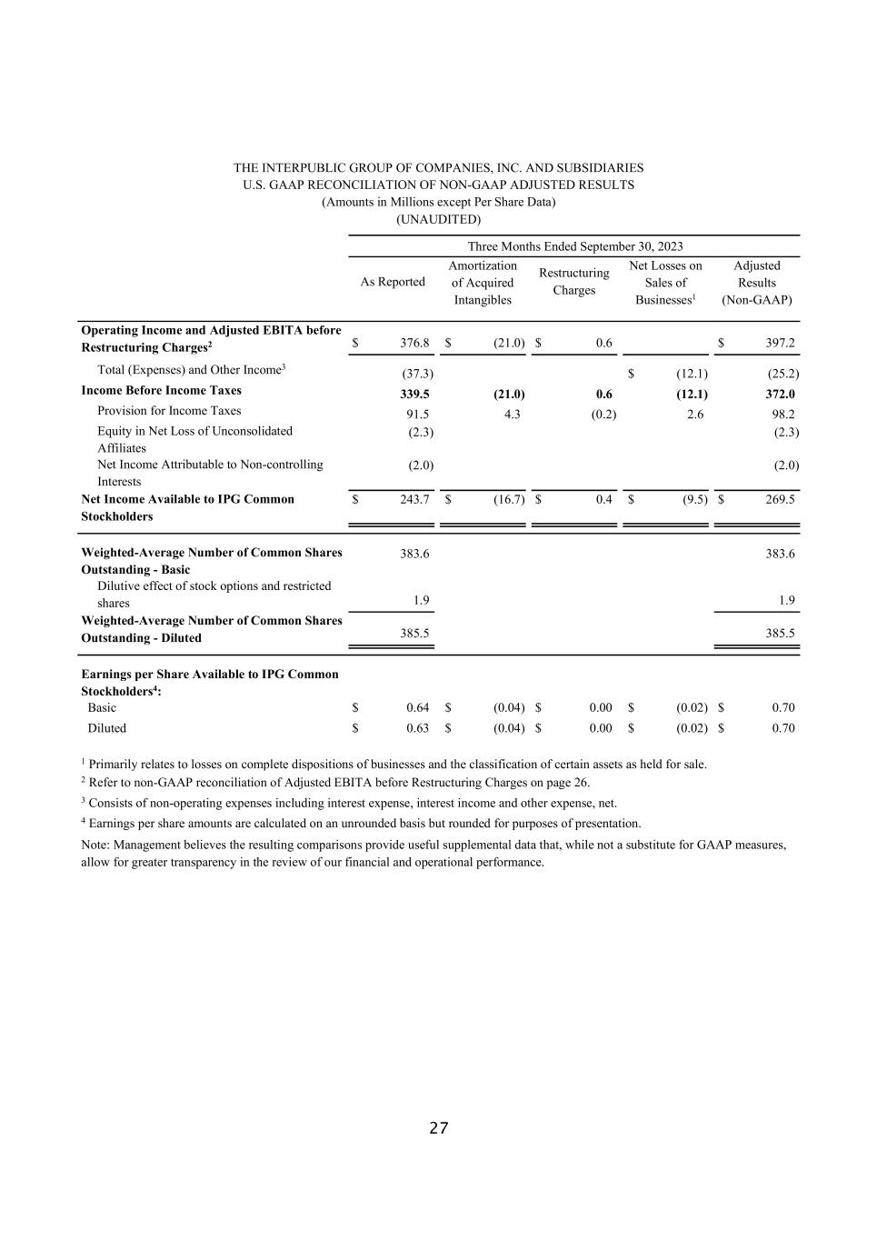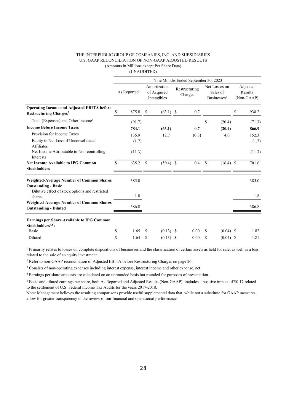 27 THE INTERPUBLIC GROUP OF COMPANIES, INC. AND SUBSIDIARIES U.S. GAAP RECONCILIATION OF NON-GAAP ADJUSTED RESULTS (Amounts in Millions except Per Share Data) (UNAUDITED) Three Months Ended September 30, 2023 As Reported Amortization of Acquired Intangibles Restructuring Charges Net Losses on Sales of Businesses1 Adjusted Results (Non-GAAP) Operating Income and Adjusted EBITA before Restructuring Charges2 $ 376.8 $ (21.0) $ 0.6 $ 397.2 Total (Expenses) and Other Income3 (37.3) $ (12.1) (25.2) Income Before Income Taxes 339.5 (21.0) 0.6 (12.1) 372.0 Provision for Income Taxes 91.5 4.3 (0.2) 2.6 98.2 Equity in Net Loss of Unconsolidated Affiliates (2.3) (2.3) Net Income Attributable to Non-controlling Interests (2.0) (2.0) Net Income Available to IPG Common Stockholders $ 243.7 $ (16.7) $ 0.4 $ (9.5) $ 269.5 Weighted-Average Number of Common Shares Outstanding - Basic 383.6 383.6 Dilutive effect of stock options and restricted shares 1.9 1.9 Weighted-Average Number of Common Shares Outstanding - Diluted 385.5 385.5 Earnings per Share Available to IPG Common Stockholders4: Basic $ 0.64 $ (0.04) $ 0.00 $ (0.02) $ 0.70 Diluted $ 0.63 $ (0.04) $ 0.00 $ (0.02) $ 0.70 1 Primarily relates to losses on complete dispositions of businesses and the classification of certain assets as held for sale. 2 Refer to non-GAAP reconciliation of Adjusted EBITA before Restructuring Charges on page 26. 3 Consists of non-operating expenses including interest expense, interest income and other expense, net. 4 Earnings per share amounts are calculated on an unrounded basis but rounded for purposes of presentation. Note: Management believes the resulting comparisons provide useful supplemental data that, while not a substitute for GAAP measures, allow for greater transparency in the review of our financial and operational performance.