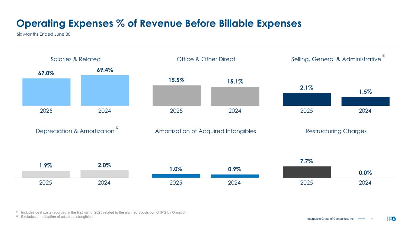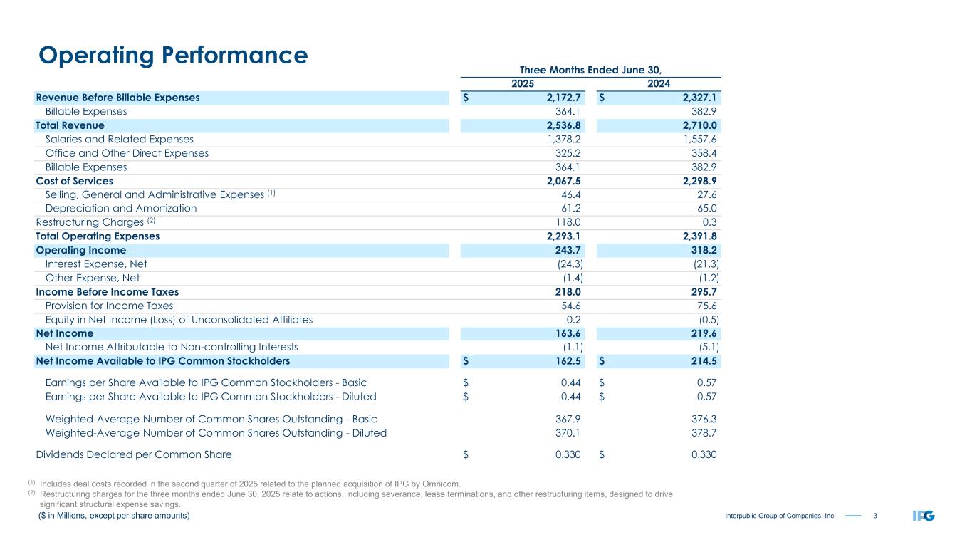 12Interpublic Group of Companies, Inc. Six Months Ended June 30, 2025 2024 Revenue Before Billable Expenses $ 4,169.0 $ 4,510.0 Billable Expenses 690.4 695.9 Total Revenue 4,859.4 5,205.9 Salaries and Related Expenses 2,792.6 3,130.4 Office and Other Direct Expenses 644.4 680.5 Billable Expenses 690.4 695.9 Cost of Services 4,127.4 4,506.8 Selling, General and Administrative Expenses (1) 86.8 65.6 Depreciation and Amortization 122.2 130.2 Restructuring Charges (2) 321.3 0.9 Total Operating Expenses 4,657.7 4,703.5 Operating Income 201.7 502.4 Interest Expense, Net (39.8) (35.4) Other Expense, Net (38.3) (10.7) Income Before Income Taxes 123.6 456.3 Provision for Income Taxes 45.4 122.9 Equity in Net Income (Loss) of Unconsolidated Affiliates 0.1 (0.2) Net Income 78.3 333.2 Net Income Attributable to Non-controlling Interests (1.2) (8.3) Net Income Available to IPG Common Stockholders $ 77.1 $ 324.9 Earnings per Share Available to IPG Common Stockholders - Basic $ 0.21 $ 0.86 Earnings per Share Available to IPG Common Stockholders - Diluted $ 0.21 $ 0.86 Weighted-Average Number of Common Shares Outstanding - Basic 370.2 377.4 Weighted-Average Number of Common Shares Outstanding - Diluted 372.5 379.7 Dividends Declared per Common Share $ 0.660 $ 0.660 ($ in Millions, except per share amounts) Operating Performance (1) Includes deal costs recorded in the first half of 2025 related to the planned acquisition of IPG by Omnicom. (2) Restructuring charges for the six months ended June 30, 2025 relate to actions, including severance, lease terminations, and other restructuring items, designed to drive significant structural expense savings.