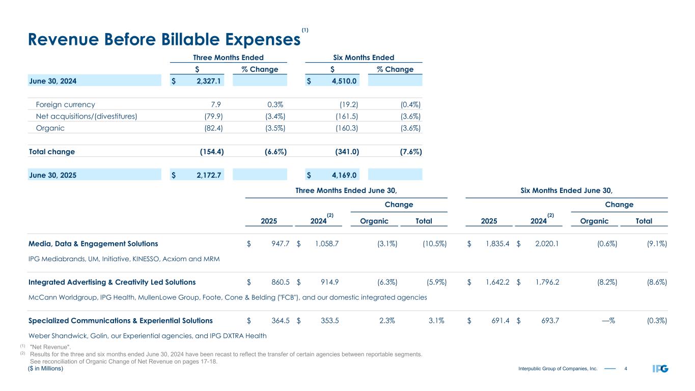 4Interpublic Group of Companies, Inc. Revenue Before Billable Expenses Three Months Ended June 30, Six Months Ended June 30, Change Change 2025 2024 Organic Total 2025 2024 Organic Total Media, Data & Engagement Solutions $ 947.7 $ 1,058.7 (3.1%) (10.5%) $ 1,835.4 $ 2,020.1 (0.6%) (9.1%) IPG Mediabrands, UM, Initiative, KINESSO, Acxiom and MRM Integrated Advertising & Creativity Led Solutions $ 860.5 $ 914.9 (6.3%) (5.9%) $ 1,642.2 $ 1,796.2 (8.2%) (8.6%) McCann Worldgroup, IPG Health, MullenLowe Group, Foote, Cone & Belding ("FCB"), and our domestic integrated agencies Specialized Communications & Experiential Solutions $ 364.5 $ 353.5 2.3% 3.1% $ 691.4 $ 693.7 —% (0.3%) Weber Shandwick, Golin, our Experiential agencies, and IPG DXTRA Health (1) "Net Revenue". (2) Results for the three and six months ended June 30, 2024 have been recast to reflect the transfer of certain agencies between reportable segments. See reconciliation of Organic Change of Net Revenue on pages 17-18. ($ in Millions) Three Months Ended Six Months Ended $ % Change $ % Change June 30, 2024 $ 2,327.1 $ 4,510.0 Foreign currency 7.9 0.3% (19.2) (0.4%) Net acquisitions/(divestitures) (79.9) (3.4%) (161.5) (3.6%) Organic (82.4) (3.5%) (160.3) (3.6%) Total change (154.4) (6.6%) (341.0) (7.6%) June 30, 2025 $ 2,172.7 $ 4,169.0 (1) (2) (2)