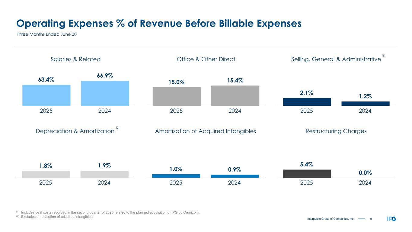 6Interpublic Group of Companies, Inc. Operating Expenses % of Revenue Before Billable Expenses (1) Includes deal costs recorded in the second quarter of 2025 related to the planned acquisition of IPG by Omnicom. (2) Excludes amortization of acquired intangibles. (2) Three Months Ended June 30 (1)