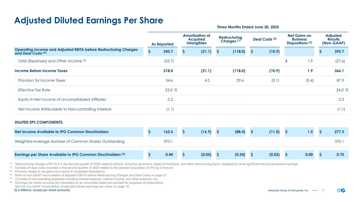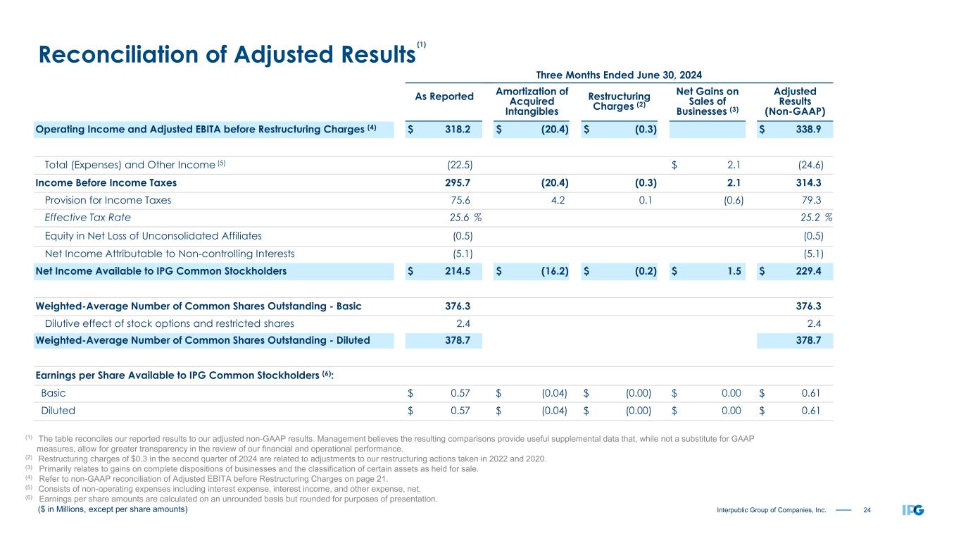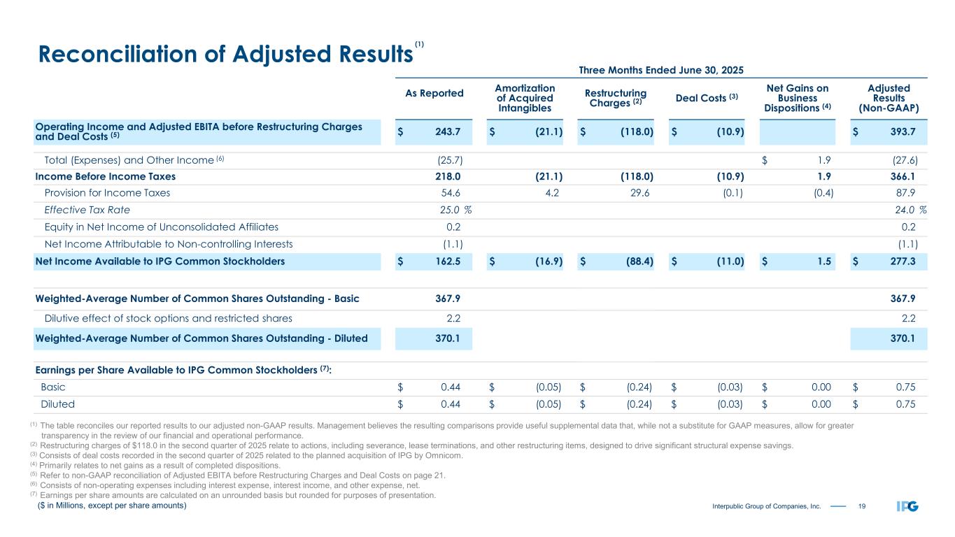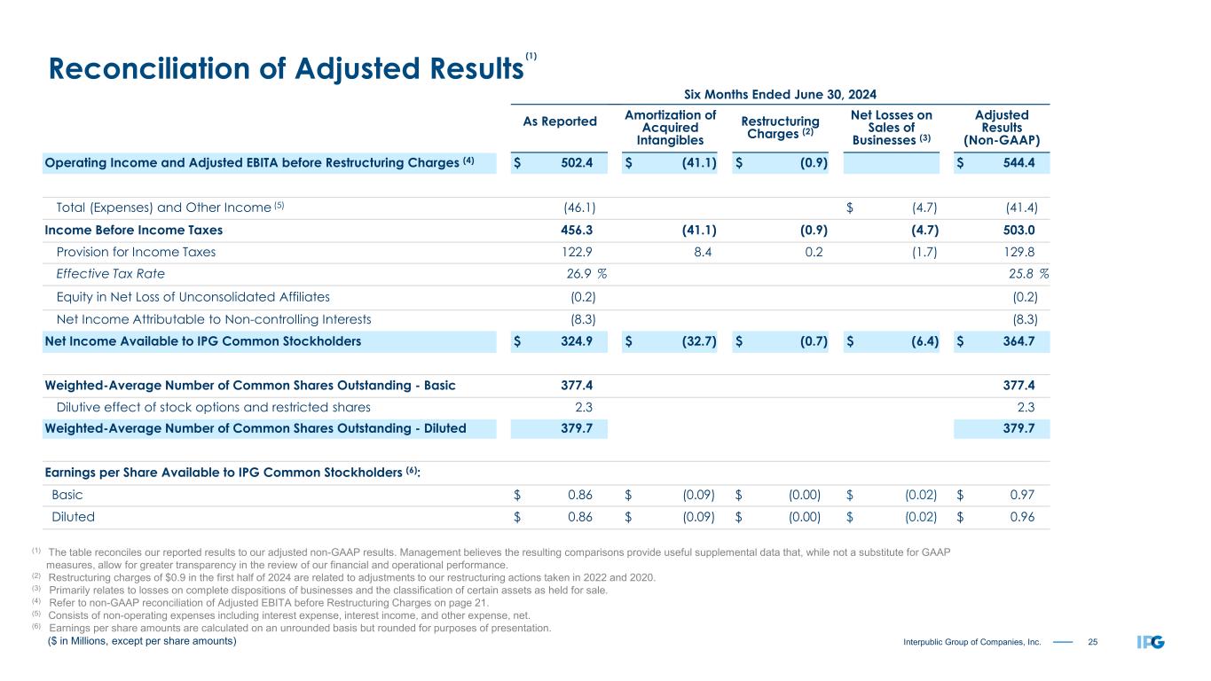 24Interpublic Group of Companies, Inc. Three Months Ended June 30, 2024 As Reported Amortization of Acquired Intangibles Restructuring Charges (2) Net Gains on Sales of Businesses (3) Adjusted Results (Non-GAAP) Operating Income and Adjusted EBITA before Restructuring Charges (4) $ 318.2 $ (20.4) $ (0.3) $ 338.9 Total (Expenses) and Other Income (5) (22.5) $ 2.1 (24.6) Income Before Income Taxes 295.7 (20.4) (0.3) 2.1 314.3 Provision for Income Taxes 75.6 4.2 0.1 (0.6) 79.3 Effective Tax Rate 25.6 % 25.2 % Equity in Net Loss of Unconsolidated Affiliates (0.5) (0.5) Net Income Attributable to Non-controlling Interests (5.1) (5.1) Net Income Available to IPG Common Stockholders $ 214.5 $ (16.2) $ (0.2) $ 1.5 $ 229.4 Weighted-Average Number of Common Shares Outstanding - Basic 376.3 376.3 Dilutive effect of stock options and restricted shares 2.4 2.4 Weighted-Average Number of Common Shares Outstanding - Diluted 378.7 378.7 Earnings per Share Available to IPG Common Stockholders (6): Basic $ 0.57 $ (0.04) $ (0.00) $ 0.00 $ 0.61 Diluted $ 0.57 $ (0.04) $ (0.00) $ 0.00 $ 0.61 ($ in Millions, except per share amounts) (1) The table reconciles our reported results to our adjusted non-GAAP results. Management believes the resulting comparisons provide useful supplemental data that, while not a substitute for GAAP measures, allow for greater transparency in the review of our financial and operational performance. (2) Restructuring charges of $0.3 in the second quarter of 2024 are related to adjustments to our restructuring actions taken in 2022 and 2020. (3) Primarily relates to gains on complete dispositions of businesses and the classification of certain assets as held for sale. (4) Refer to non-GAAP reconciliation of Adjusted EBITA before Restructuring Charges on page 21. (5) Consists of non-operating expenses including interest expense, interest income, and other expense, net. (6) Earnings per share amounts are calculated on an unrounded basis but rounded for purposes of presentation. Reconciliation of Adjusted Results(1)