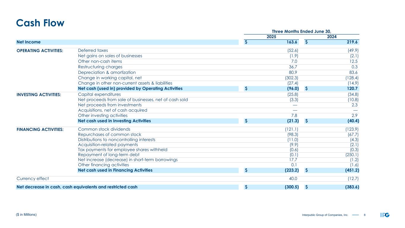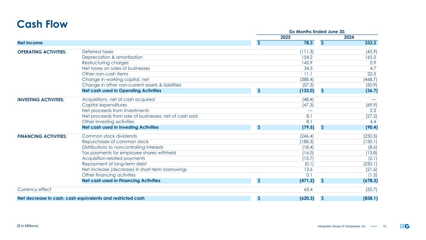 15Interpublic Group of Companies, Inc. Six Months Ended June 30, 2025 2024 Net Income $ 78.3 $ 333.2 OPERATING ACTIVITIES: Deferred taxes (111.3) (43.9) Depreciation & amortization 154.2 165.5 Restructuring charges 145.9 0.9 Net losses on sales of businesses 34.5 4.7 Other non-cash items 11.1 22.5 Change in working capital, net (388.4) (468.7) Change in other non-current assets & liabilities (57.3) (50.9) Net cash used in Operating Activities $ (133.0) $ (36.7) INVESTING ACTIVITIES: Acquisitions, net of cash acquired (48.4) — Capital expenditures (47.3) (69.9) Net proceeds from investments — 2.3 Net proceeds from sale of businesses, net of cash sold 8.1 (27.2) Other investing activities 8.1 4.4 Net cash used in Investing Activities $ (79.5) $ (90.4) FINANCING ACTIVITIES: Common stock dividends (246.4) (250.5) Repurchases of common stock (188.3) (130.1) Distributions to noncontrolling interests (18.4) (8.6) Tax payments for employee shares withheld (16.0) (13.8) Acquisition-related payments (15.7) (2.1) Repayment of long-term debt (0.1) (250.1) Net increase (decrease) in short-term borrowings 13.6 (21.6) Other financing activities 0.1 (1.5) Net cash used in Financing Activities $ (471.2) $ (678.3) Currency effect 63.4 (32.7) Net decrease in cash, cash equivalents and restricted cash $ (620.3) $ (838.1) ($ in Millions) Cash Flow