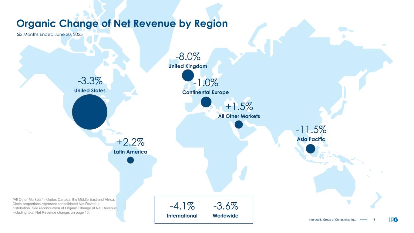 18Interpublic Group of Companies, Inc. ($ in Millions) Components of Change Change Six Months Ended June 30, 2024 (1) Foreign Currency Net Acquisitions / (Divestitures) Organic Six Months Ended June 30, 2025 Organic Total SEGMENT: Media, Data & Engagement Solutions (2) $ 2,020.1 $ (12.7) (159.3) $ (12.7) $ 1,835.4 (0.6%) (9.1%) Integrated Advertising & Creativity Led Solutions (3) 1,796.2 (6.7) 0.0 (147.3) 1,642.2 (8.2%) (8.6%) Specialized Communications & Experiential Solutions (4) 693.7 0.2 (2.2) (0.3) 691.4 0.0% (0.3%) Total $ 4,510.0 $ (19.2) $ (161.5) $ (160.3) $ 4,169.0 (3.6%) (7.6%) GEOGRAPHIC: United States $ 3,001.8 $ 0.0 $ (118.3) $ (99.0) $ 2,784.5 (3.3%) (7.2%) International 1,508.2 (19.2) (43.2) (61.3) 1,384.5 (4.1%) (8.2%) United Kingdom 371.7 7.8 (12.4) (29.7) 337.4 (8.0%) (9.2%) Continental Europe 378.7 0.7 (3.7) (3.9) 371.8 (1.0%) (1.8%) Asia Pacific 310.1 (3.4) (11.6) (35.6) 259.5 (11.5%) (16.3%) Latin America 189.3 (19.4) (14.7) 4.1 159.3 2.2% (15.8%) All Other Markets 258.4 (4.9) (0.8) 3.8 256.5 1.5% (0.7%) Worldwide $ 4,510.0 $ (19.2) $ (161.5) $ (160.3) $ 4,169.0 (3.6%) (7.6%) Reconciliation of Organic Change of Net Revenue (1) Results for the six months ended June 30, 2024 have been recast to reflect the transfer of certain agencies between reportable segments. (2) Comprised of IPG Mediabrands, UM, Initiative, KINESSO, Acxiom and MRM. (3) Comprised of McCann Worldgroup, IPG Health, MullenLowe Group, Foote, Cone & Belding ("FCB"), and our domestic integrated agencies. (4) Comprised of Weber Shandwick, Golin, our Experiential agencies, and IPG DXTRA Health.