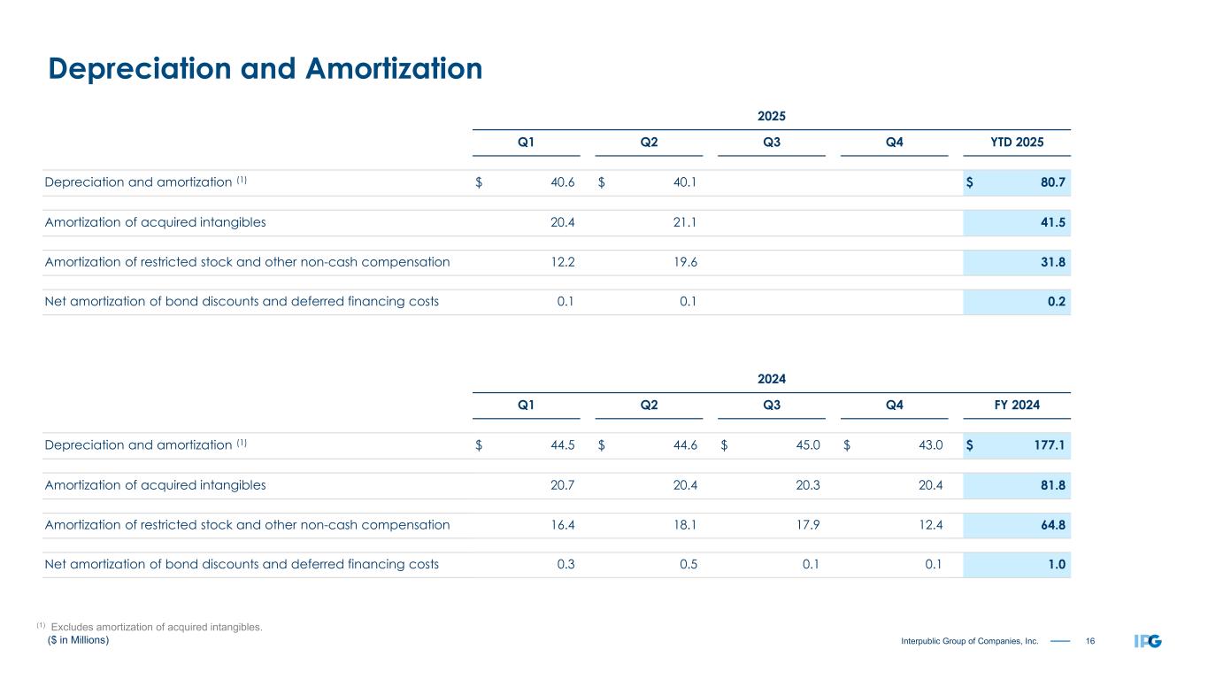 16Interpublic Group of Companies, Inc. 2025 Q1 Q2 Q3 Q4 YTD 2025 Depreciation and amortization (1) $ 40.6 $ 40.1 $ 80.7 Amortization of acquired intangibles 20.4 21.1 41.5 Amortization of restricted stock and other non-cash compensation 12.2 19.6 31.8 Net amortization of bond discounts and deferred financing costs 0.1 0.1 0.2 2024 Q1 Q2 Q3 Q4 FY 2024 Depreciation and amortization (1) $ 44.5 $ 44.6 $ 45.0 $ 43.0 $ 177.1 Amortization of acquired intangibles 20.7 20.4 20.3 20.4 81.8 Amortization of restricted stock and other non-cash compensation 16.4 18.1 17.9 12.4 64.8 Net amortization of bond discounts and deferred financing costs 0.3 0.5 0.1 0.1 1.0 ($ in Millions) (1) Excludes amortization of acquired intangibles. Depreciation and Amortization