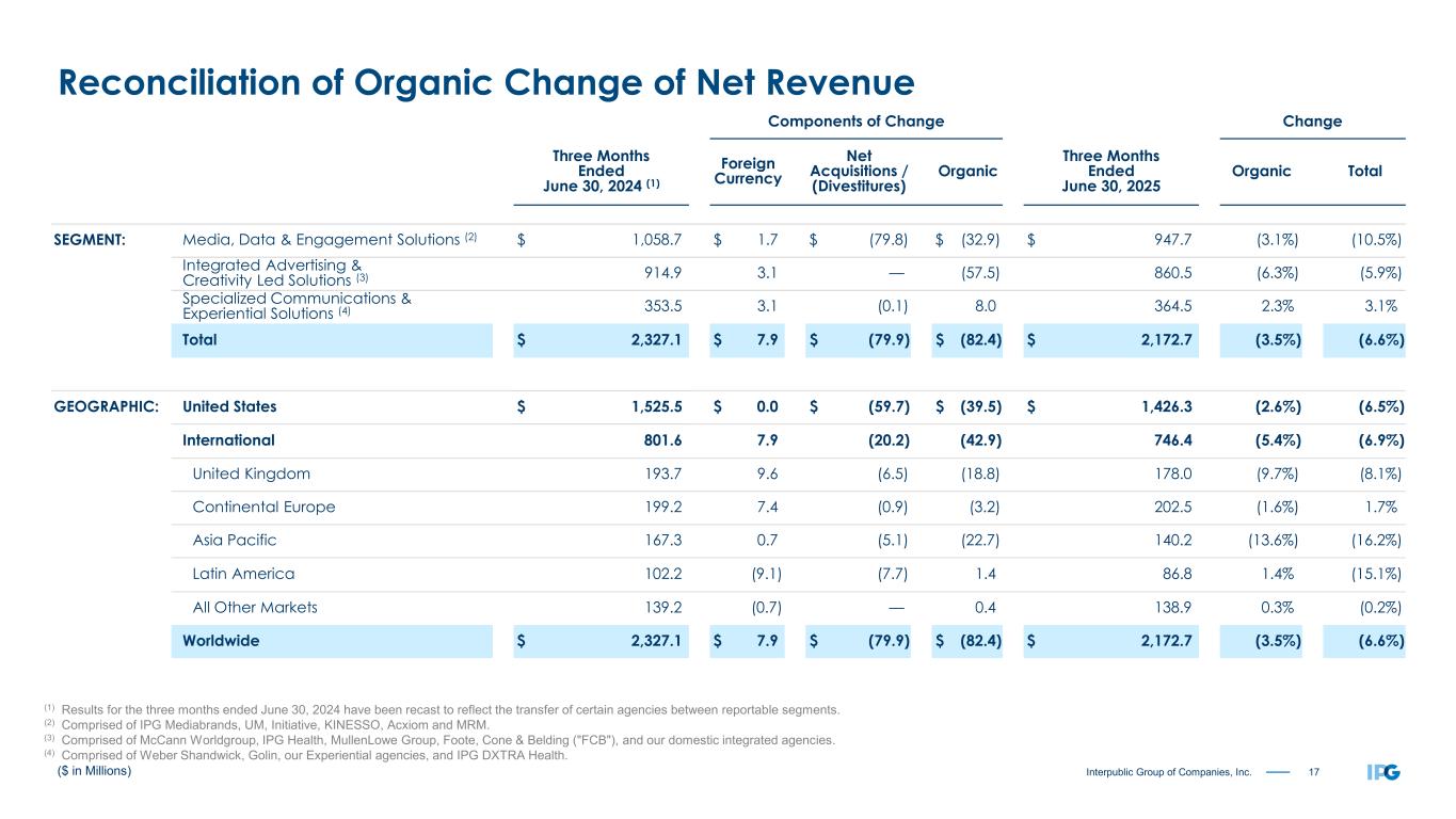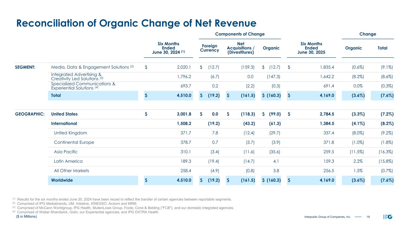 17Interpublic Group of Companies, Inc. Components of Change Change Three Months Ended June 30, 2024 (1) Foreign Currency Net Acquisitions / (Divestitures) Organic Three Months Ended June 30, 2025 Organic Total SEGMENT: Media, Data & Engagement Solutions (2) $ 1,058.7 $ 1.7 $ (79.8) $ (32.9) $ 947.7 (3.1%) (10.5%) Integrated Advertising & Creativity Led Solutions (3) 914.9 3.1 — (57.5) 860.5 (6.3%) (5.9%) Specialized Communications & Experiential Solutions (4) 353.5 3.1 (0.1) 8.0 364.5 2.3% 3.1% Total $ 2,327.1 $ 7.9 $ (79.9) $ (82.4) $ 2,172.7 (3.5%) (6.6%) GEOGRAPHIC: United States $ 1,525.5 $ 0.0 $ (59.7) $ (39.5) $ 1,426.3 (2.6%) (6.5%) International 801.6 7.9 (20.2) (42.9) 746.4 (5.4%) (6.9%) United Kingdom 193.7 9.6 (6.5) (18.8) 178.0 (9.7%) (8.1%) Continental Europe 199.2 7.4 (0.9) (3.2) 202.5 (1.6%) 1.7% Asia Pacific 167.3 0.7 (5.1) (22.7) 140.2 (13.6%) (16.2%) Latin America 102.2 (9.1) (7.7) 1.4 86.8 1.4% (15.1%) All Other Markets 139.2 (0.7) — 0.4 138.9 0.3% (0.2%) Worldwide $ 2,327.1 $ 7.9 $ (79.9) $ (82.4) $ 2,172.7 (3.5%) (6.6%) ($ in Millions) Reconciliation of Organic Change of Net Revenue (1) Results for the three months ended June 30, 2024 have been recast to reflect the transfer of certain agencies between reportable segments. (2) Comprised of IPG Mediabrands, UM, Initiative, KINESSO, Acxiom and MRM. (3) Comprised of McCann Worldgroup, IPG Health, MullenLowe Group, Foote, Cone & Belding ("FCB"), and our domestic integrated agencies. (4) Comprised of Weber Shandwick, Golin, our Experiential agencies, and IPG DXTRA Health.