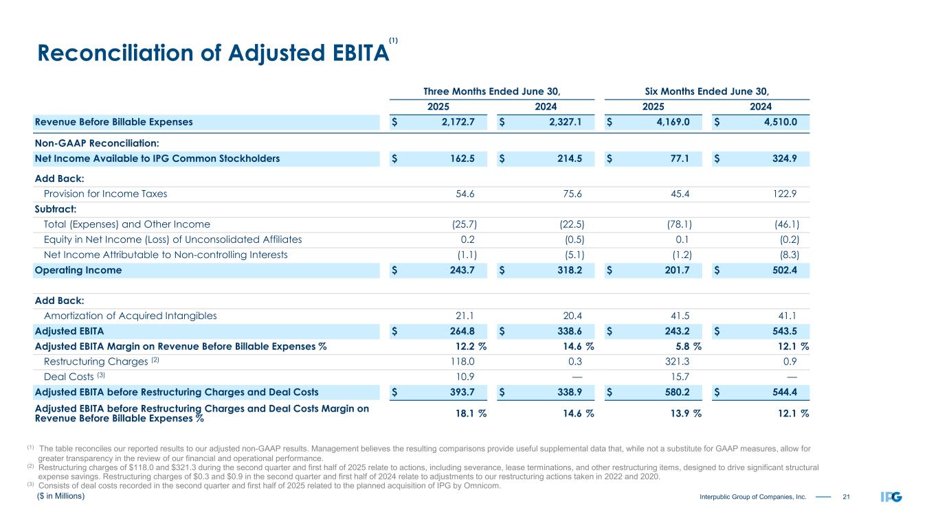 20Interpublic Group of Companies, Inc. Reconciliation of Adjusted Results(1) Six Months Ended June 30, 2025 As Reported Amortization of Acquired Intangibles Restructuring Charges (2) Deal Costs (3) Net Losses on Business Dispositions (4) Adjusted Results (Non-GAAP) Operating Income and Adjusted EBITA before Restructuring Charges and Deal Costs (5) $ 201.7 $ (41.5) $ (321.3) $ (15.7) $ 580.2 Total (Expenses) and Other Income (6) (78.1) $ (34.5) (43.6) Income Before Income Taxes 123.6 (41.5) (321.3) (15.7) (34.5) 536.6 Provision for Income Taxes 45.4 8.4 79.2 0.1 1.1 134.2 Effective Tax Rate 36.7 % 25.0 % Equity in Net Income of Unconsolidated Affiliates 0.1 0.1 Net Income Attributable to Non-controlling Interests (1.2) (1.2) Net Income Available to IPG Common Stockholders $ 77.1 $ (33.1) $ (242.1) $ (15.6) $ (33.4) $ 401.3 Weighted-Average Number of Common Shares Outstanding - Basic 370.2 370.2 Dilutive effect of stock options and restricted shares 2.3 2.3 Weighted-Average Number of Common Shares Outstanding - Diluted 372.5 372.5 Earnings per Share Available to IPG Common Stockholders (7): Basic $ 0.21 $ (0.09) $ (0.65) $ (0.04) $ (0.09) $ 1.08 Diluted $ 0.21 $ (0.09) $ (0.65) $ (0.04) $ (0.09) $ 1.08 (1) The table reconciles our reported results to our adjusted non-GAAP results. Management believes the resulting comparisons provide useful supplemental data that, while not a substitute for GAAP measures, allow for greater transparency in the review of our financial and operational performance. (2) Restructuring charges of $321.3 in the first half of 2025 relate to actions, including severance, lease terminations, and other restructuring items, designed to drive significant structural expense savings. (3) Consists of deal costs recorded in the first half of 2025 related to the planned acquisition of IPG by Omnicom. (4) Primarily relates to net losses as a result of completed dispositions. (5) Refer to non-GAAP reconciliation of Adjusted EBITA before Restructuring Charges and Deal Costs on page 21. (6) Consists of non-operating expenses including interest expense, interest income, and other expense, net. (7) Earnings per share amounts are calculated on an unrounded basis but rounded for purposes of presentation. ($ in Millions, except per share amounts)