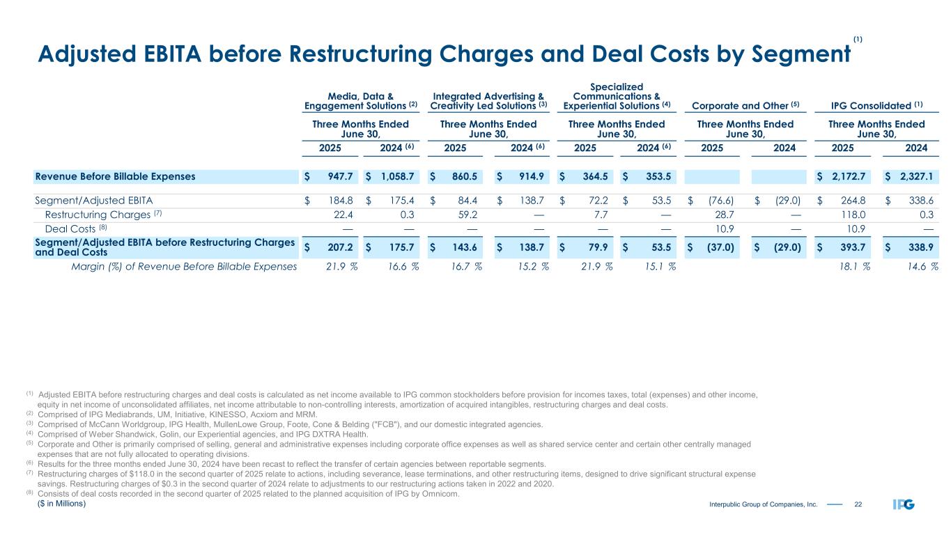 21Interpublic Group of Companies, Inc. Reconciliation of Adjusted EBITA Three Months Ended June 30, Six Months Ended June 30, 2025 2024 2025 2024 Revenue Before Billable Expenses $ 2,172.7 $ 2,327.1 $ 4,169.0 $ 4,510.0 Non-GAAP Reconciliation: Net Income Available to IPG Common Stockholders $ 162.5 $ 214.5 $ 77.1 $ 324.9 Add Back: Provision for Income Taxes 54.6 75.6 45.4 122.9 Subtract: Total (Expenses) and Other Income (25.7) (22.5) (78.1) (46.1) Equity in Net Income (Loss) of Unconsolidated Affiliates 0.2 (0.5) 0.1 (0.2) Net Income Attributable to Non-controlling Interests (1.1) (5.1) (1.2) (8.3) Operating Income $ 243.7 $ 318.2 $ 201.7 $ 502.4 Add Back: Amortization of Acquired Intangibles 21.1 20.4 41.5 41.1 Adjusted EBITA $ 264.8 $ 338.6 $ 243.2 $ 543.5 Adjusted EBITA Margin on Revenue Before Billable Expenses % 12.2 % 14.6 % 5.8 % 12.1 % Restructuring Charges (2) 118.0 0.3 321.3 0.9 Deal Costs (3) 10.9 — 15.7 — Adjusted EBITA before Restructuring Charges and Deal Costs $ 393.7 $ 338.9 $ 580.2 $ 544.4 Adjusted EBITA before Restructuring Charges and Deal Costs Margin on Revenue Before Billable Expenses % 18.1 % 14.6 % 13.9 % 12.1 % (1) ($ in Millions) (1) The table reconciles our reported results to our adjusted non-GAAP results. Management believes the resulting comparisons provide useful supplemental data that, while not a substitute for GAAP measures, allow for greater transparency in the review of our financial and operational performance. (2) Restructuring charges of $118.0 and $321.3 during the second quarter and first half of 2025 relate to actions, including severance, lease terminations, and other restructuring items, designed to drive significant structural expense savings. Restructuring charges of $0.3 and $0.9 in the second quarter and first half of 2024 relate to adjustments to our restructuring actions taken in 2022 and 2020. (3) Consists of deal costs recorded in the second quarter and first half of 2025 related to the planned acquisition of IPG by Omnicom.