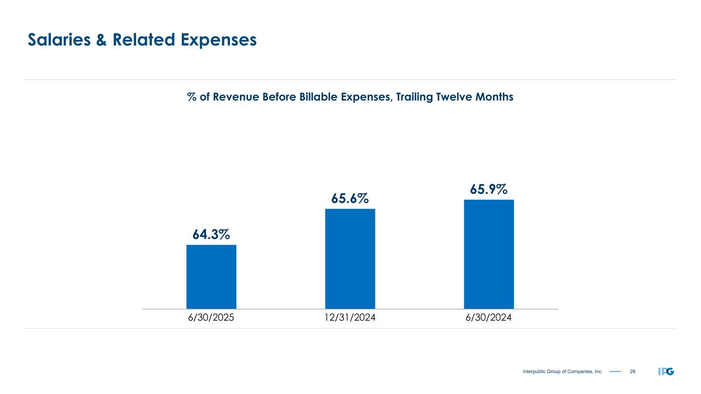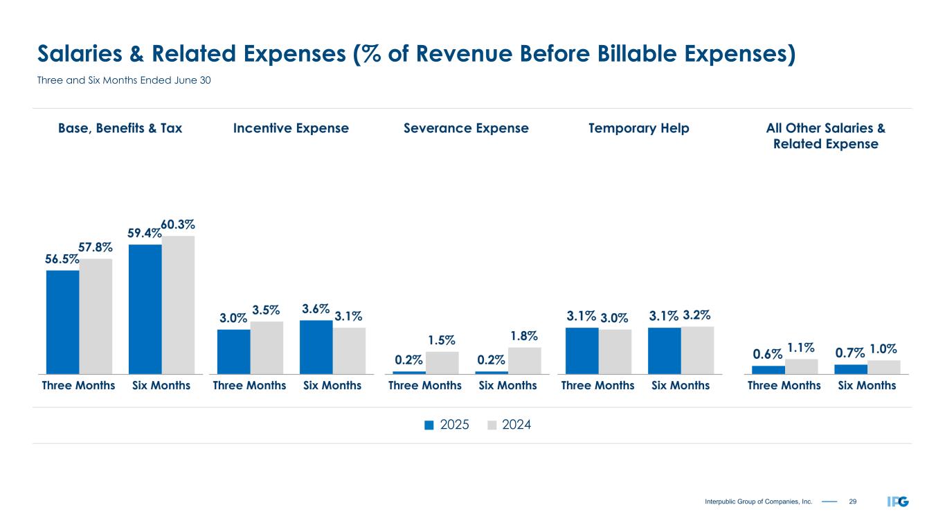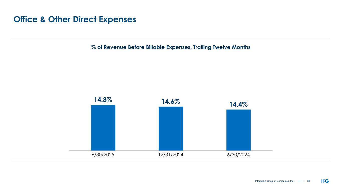 29Interpublic Group of Companies, Inc. Salaries & Related Expenses (% of Revenue Before Billable Expenses) Three and Six Months Ended June 30 2025 2024