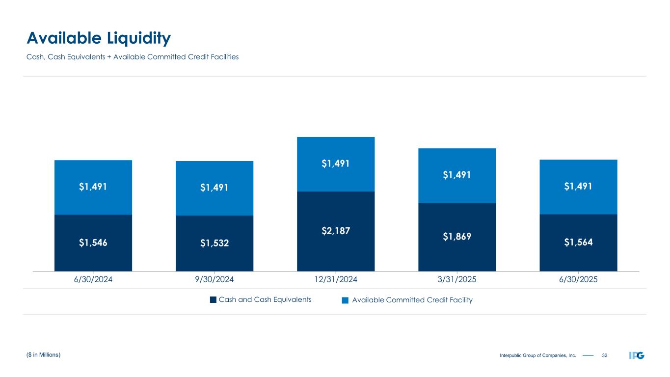 31Interpublic Group of Companies, Inc. Office & Other Direct Expenses (% of Revenue Before Billable Expenses) “All Other” primarily includes software and cloud based expenses, client service costs, travel and entertainment, professional fees, spending to support new business activity, telecommunications, non-pass through production expenses, office supplies, bad debt expense, foreign currency losses (gains), adjustments to contingent acquisition obligations and other expenses. 2025 2024 Three and Six Months Ended June 30