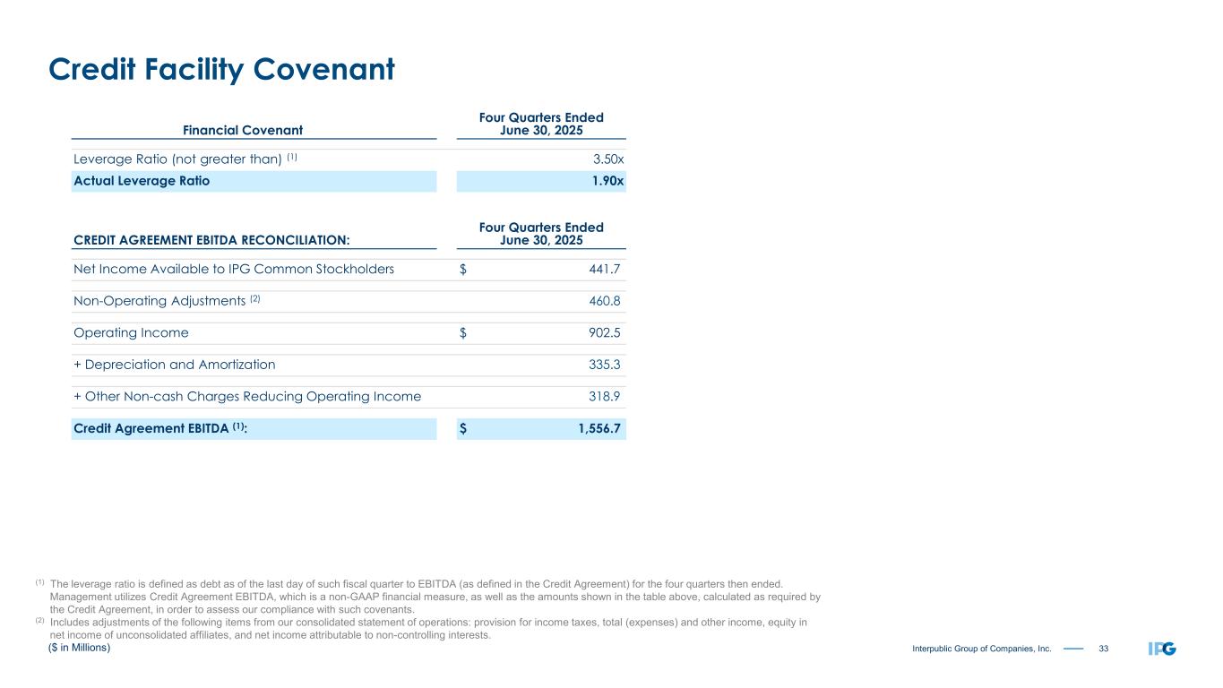 33Interpublic Group of Companies, Inc. Financial Covenant Four Quarters Ended June 30, 2025 Leverage Ratio (not greater than) (1) 3.50x Actual Leverage Ratio 1.90x CREDIT AGREEMENT EBITDA RECONCILIATION: Four Quarters Ended June 30, 2025 Net Income Available to IPG Common Stockholders $ 441.7 Non-Operating Adjustments (2) 460.8 Operating Income $ 902.5 + Depreciation and Amortization 335.3 + Other Non-cash Charges Reducing Operating Income 318.9 Credit Agreement EBITDA (1): $ 1,556.7 ($ in Millions) Credit Facility Covenant (1) The leverage ratio is defined as debt as of the last day of such fiscal quarter to EBITDA (as defined in the Credit Agreement) for the four quarters then ended. Management utilizes Credit Agreement EBITDA, which is a non-GAAP financial measure, as well as the amounts shown in the table above, calculated as required by the Credit Agreement, in order to assess our compliance with such covenants. (2) Includes adjustments of the following items from our consolidated statement of operations: provision for income taxes, total (expenses) and other income, equity in net income of unconsolidated affiliates, and net income attributable to non-controlling interests.