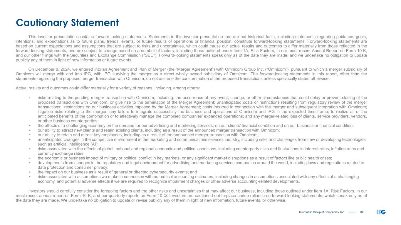 34Interpublic Group of Companies, Inc. Cautionary Statement This investor presentation contains forward-looking statements. Statements in this investor presentation that are not historical facts, including statements regarding guidance, goals, intentions, and expectations as to future plans, trends, events, or future results of operations or financial position, constitute forward-looking statements. Forward-looking statements are based on current expectations and assumptions that are subject to risks and uncertainties, which could cause our actual results and outcomes to differ materially from those reflected in the forward-looking statements, and are subject to change based on a number of factors, including those outlined under Item 1A, Risk Factors, in our most recent Annual Report on Form 10-K, and our other filings with the Securities and Exchange Commission ("SEC"). Forward-looking statements speak only as of the date they are made, and we undertake no obligation to update publicly any of them in light of new information or future events. On December 8, 2024, we entered into an Agreement and Plan of Merger (the “Merger Agreement”) with Omnicom Group Inc. (“Omnicom”), pursuant to which a merger subsidiary of Omnicom will merge with and into IPG, with IPG surviving the merger as a direct wholly owned subsidiary of Omnicom. The forward-looking statements in this report, other than the statements regarding the proposed merger transaction with Omnicom, do not assume the consummation of the proposed transactions unless specifically stated otherwise. Actual results and outcomes could differ materially for a variety of reasons, including, among others: ▪ risks relating to the pending merger transaction with Omnicom, including: the occurrence of any event, change, or other circumstances that could delay or prevent closing of the proposed transactions with Omnicom, or give rise to the termination of the Merger Agreement; unanticipated costs or restrictions resulting from regulatory review of the merger transactions; restrictions on our business activities imposed by the Merger Agreement; costs incurred in connection with the merger and subsequent integration with Omnicom; litigation risks relating to the merger; any failure to integrate successfully the business and operations of Omnicom and IPG in the expected time frame, to realize all of the anticipated benefits of the combination or to effectively manage the combined companies’ expanded operations; and any merger-related loss of clients, service providers, vendors, or other business counterparties; ▪ the effects of a challenging economy on the demand for our advertising and marketing services, on our clients’ financial condition and on our business or financial condition; ▪ our ability to attract new clients and retain existing clients, including as a result of the announced merger transaction with Omnicom; ▪ our ability to retain and attract key employees, including as a result of the announced merger transaction with Omnicom; ▪ unanticipated changes in the competitive environment in the marketing and communications services industry, including risks and challenges from new or developing technologies such as artificial intelligence (AI); ▪ risks associated with the effects of global, national and regional economic and political conditions, including counterparty risks and fluctuations in interest rates, inflation rates and currency exchange rates; ▪ the economic or business impact of military or political conflict in key markets, or any significant market disruptions as a result of factors like public health crises; ▪ developments from changes in the regulatory and legal environment for advertising and marketing services companies around the world, including laws and regulations related to data protection and consumer privacy; ▪ the impact on our business as a result of general or directed cybersecurity events; and ▪ risks associated with assumptions we make in connection with our critical accounting estimates, including changes in assumptions associated with any effects of a challenging economy, and potential adverse effects if we are required to recognize impairment charges or other adverse accounting-related developments. Investors should carefully consider the foregoing factors and the other risks and uncertainties that may affect our business, including those outlined under Item 1A, Risk Factors, in our most recent annual report on Form 10-K, and our quarterly reports on Form 10-Q. Investors are cautioned not to place undue reliance on forward-looking statements, which speak only as of the date they are made. We undertake no obligation to update or revise publicly any of them in light of new information, future events, or otherwise.