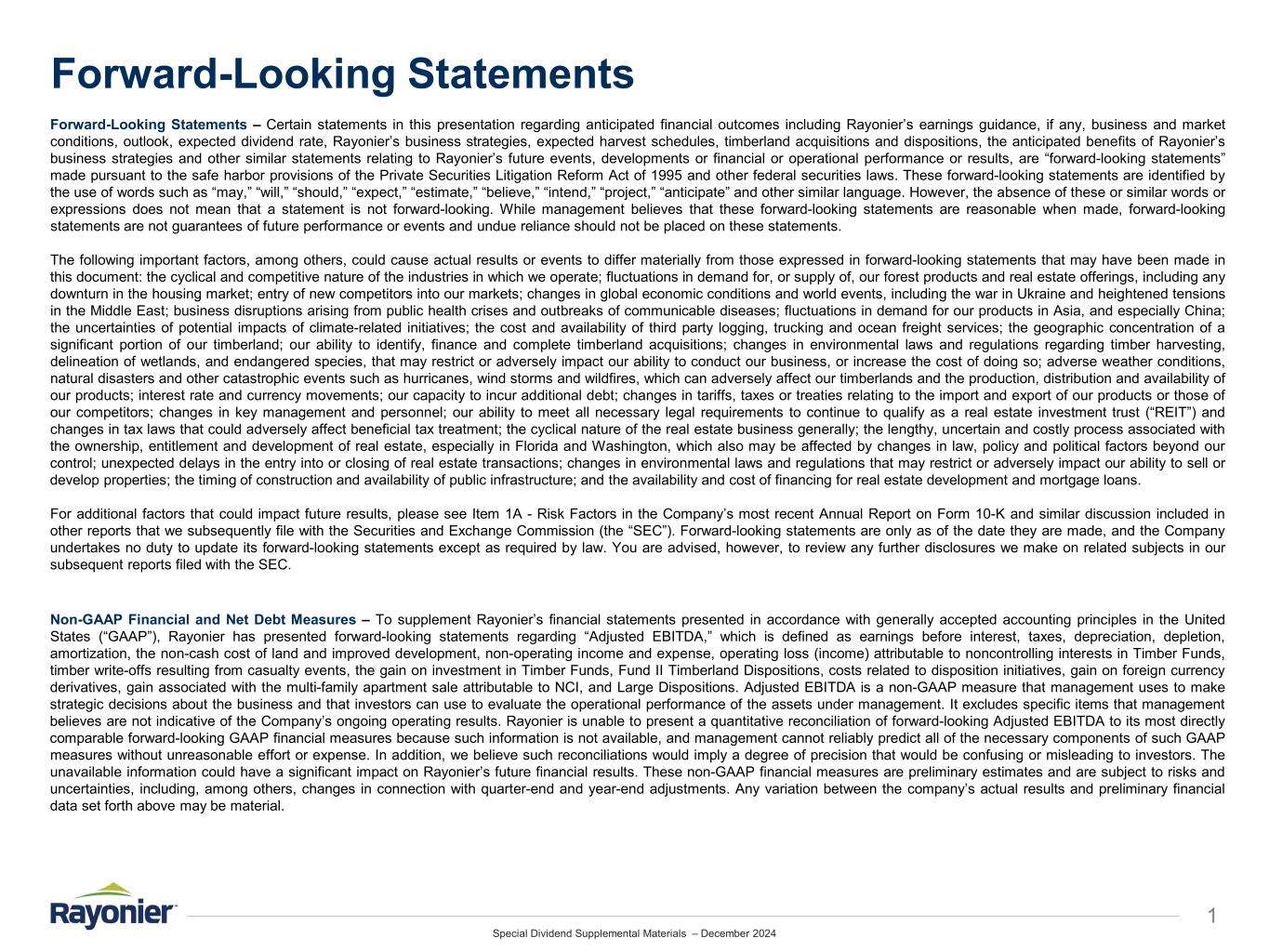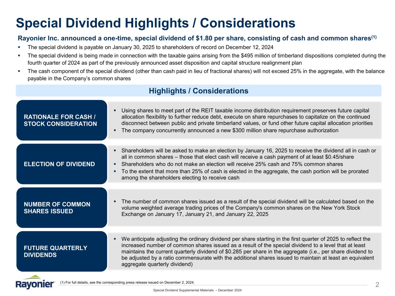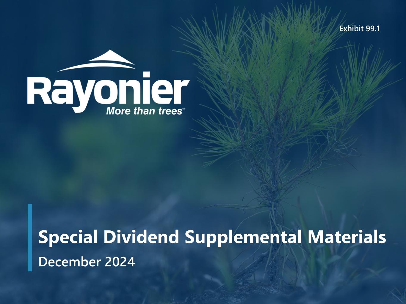 Special Dividend Supplemental Materials – December 2024 Forward-Looking Statements 1 Forward-Looking Statements – Certain statements in this presentation regarding anticipated financial outcomes including Rayonier’s earnings guidance, if any, business and market conditions, outlook, expected dividend rate, Rayonier’s business strategies, expected harvest schedules, timberland acquisitions and dispositions, the anticipated benefits of Rayonier’s business strategies and other similar statements relating to Rayonier’s future events, developments or financial or operational performance or results, are “forward-looking statements” made pursuant to the safe harbor provisions of the Private Securities Litigation Reform Act of 1995 and other federal securities laws. These forward-looking statements are identified by the use of words such as “may,” “will,” “should,” “expect,” “estimate,” “believe,” “intend,” “project,” “anticipate” and other similar language. However, the absence of these or similar words or expressions does not mean that a statement is not forward-looking. While management believes that these forward-looking statements are reasonable when made, forward-looking statements are not guarantees of future performance or events and undue reliance should not be placed on these statements. The following important factors, among others, could cause actual results or events to differ materially from those expressed in forward-looking statements that may have been made in this document: the cyclical and competitive nature of the industries in which we operate; fluctuations in demand for, or supply of, our forest products and real estate offerings, including any downturn in the housing market; entry of new competitors into our markets; changes in global economic conditions and world events, including the war in Ukraine and heightened tensions in the Middle East; business disruptions arising from public health crises and outbreaks of communicable diseases; fluctuations in demand for our products in Asia, and especially China; the uncertainties of potential impacts of climate-related initiatives; the cost and availability of third party logging, trucking and ocean freight services; the geographic concentration of a significant portion of our timberland; our ability to identify, finance and complete timberland acquisitions; changes in environmental laws and regulations regarding timber harvesting, delineation of wetlands, and endangered species, that may restrict or adversely impact our ability to conduct our business, or increase the cost of doing so; adverse weather conditions, natural disasters and other catastrophic events such as hurricanes, wind storms and wildfires, which can adversely affect our timberlands and the production, distribution and availability of our products; interest rate and currency movements; our capacity to incur additional debt; changes in tariffs, taxes or treaties relating to the import and export of our products or those of our competitors; changes in key management and personnel; our ability to meet all necessary legal requirements to continue to qualify as a real estate investment trust (“REIT”) and changes in tax laws that could adversely affect beneficial tax treatment; the cyclical nature of the real estate business generally; the lengthy, uncertain and costly process associated with the ownership, entitlement and development of real estate, especially in Florida and Washington, which also may be affected by changes in law, policy and political factors beyond our control; unexpected delays in the entry into or closing of real estate transactions; changes in environmental laws and regulations that may restrict or adversely impact our ability to sell or develop properties; the timing of construction and availability of public infrastructure; and the availability and cost of financing for real estate development and mortgage loans. For additional factors that could impact future results, please see Item 1A - Risk Factors in the Company’s most recent Annual Report on Form 10-K and similar discussion included in other reports that we subsequently file with the Securities and Exchange Commission (the “SEC”). Forward-looking statements are only as of the date they are made, and the Company undertakes no duty to update its forward-looking statements except as required by law. You are advised, however, to review any further disclosures we make on related subjects in our subsequent reports filed with the SEC. Non-GAAP Financial and Net Debt Measures – To supplement Rayonier’s financial statements presented in accordance with generally accepted accounting principles in the United States (“GAAP”), Rayonier has presented forward-looking statements regarding “Adjusted EBITDA,” which is defined as earnings before interest, taxes, depreciation, depletion, amortization, the non-cash cost of land and improved development, non-operating income and expense, operating loss (income) attributable to noncontrolling interests in Timber Funds, timber write-offs resulting from casualty events, the gain on investment in Timber Funds, Fund II Timberland Dispositions, costs related to disposition initiatives, gain on foreign currency derivatives, gain associated with the multi-family apartment sale attributable to NCI, and Large Dispositions. Adjusted EBITDA is a non-GAAP measure that management uses to make strategic decisions about the business and that investors can use to evaluate the operational performance of the assets under management. It excludes specific items that management believes are not indicative of the Company’s ongoing operating results. Rayonier is unable to present a quantitative reconciliation of forward-looking Adjusted EBITDA to its most directly comparable forward-looking GAAP financial measures because such information is not available, and management cannot reliably predict all of the ne