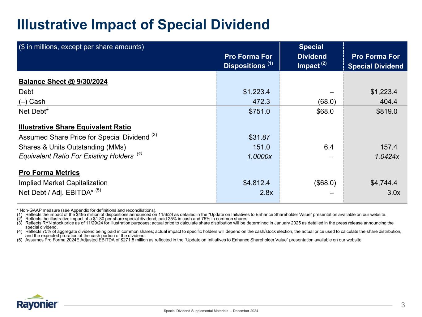 Special Dividend Supplemental Materials – December 2024 Special Dividend Highlights / Considerations 2  Using shares to meet part of the REIT taxable income distribution requirement preserves future capital allocation flexibility to further reduce debt, execute on share repurchases to capitalize on the continued disconnect between public and private timberland values, or fund other future capital allocation priorities  The company concurrently announced a new $300 million share repurchase authorization RATIONALE FOR CASH / STOCK CONSIDERATION  Shareholders will be asked to make an election by January 16, 2025 to receive the dividend all in cash or all in common shares – those that elect cash will receive a cash payment of at least $0.45/share  Shareholders who do not make an election will receive 25% cash and 75% common shares  To the extent that more than 25% of cash is elected in the aggregate, the cash portion will be prorated among the shareholders electing to receive cash ELECTION OF DIVIDEND  The number of common shares issued as a result of the special dividend will be calculated based on the volume weighted average trading prices of the Company's common shares on the New York Stock Exchange on January 17, January 21, and January 22, 2025 NUMBER OF COMMON SHARES ISSUED  We anticipate adjusting the ordinary dividend per share starting in the first quarter of 2025 to reflect the increased number of common shares issued as a result of the special dividend to a level that at least maintains the current quarterly dividend of $0.285 per share in the aggregate (i.e., per share dividend to be adjusted by a ratio commensurate with the additional shares issued to maintain at least an equivalent aggregate quarterly dividend) FUTURE QUARTERLY DIVIDENDS Rayonier Inc. announced a one-time, special dividend of $1.80 per share, consisting of cash and common shares(1)  The special dividend is payable on January 30, 2025 to shareholders of record on December 12, 2024  The special dividend is being made in connection with the taxable gains arising from the $495 million of timberland dispositions completed during the fourth quarter of 2024 as part of the previously announced asset disposition and capital structure realignment plan  The cash component of the special dividend (other than cash paid in lieu of fractional shares) will not exceed 25% in the aggregate, with the balance payable in the Company’s common shares Highlights / Considerations (1) For full details, see the corresponding press release issued on December 2, 2024.