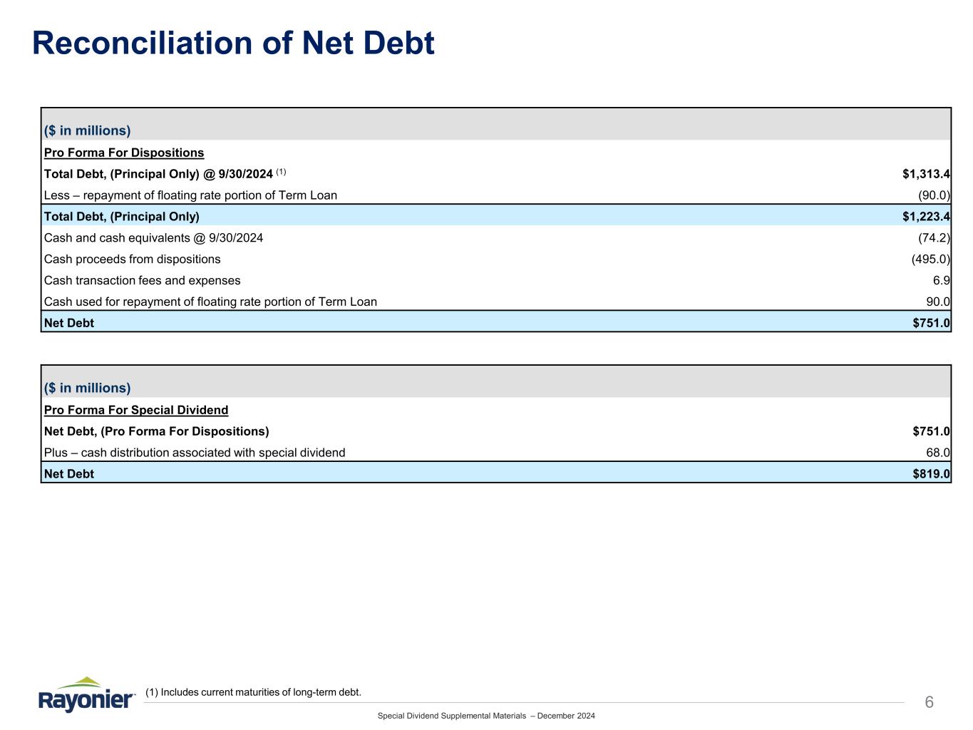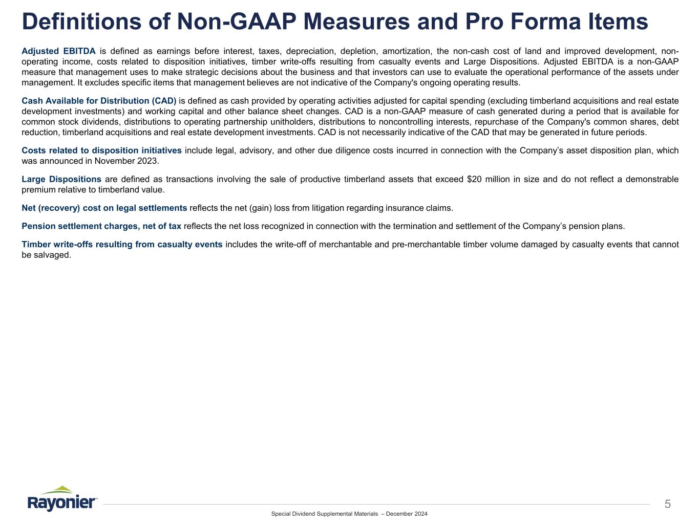 Special Dividend Supplemental Materials – December 2024 5 Definitions of Non-GAAP Measures and Pro Forma Items Adjusted EBITDA is defined as earnings before interest, taxes, depreciation, depletion, amortization, the non-cash cost of land and improved development, non- operating income, costs related to disposition initiatives, timber write-offs resulting from casualty events and Large Dispositions. Adjusted EBITDA is a non-GAAP measure that management uses to make strategic decisions about the business and that investors can use to evaluate the operational performance of the assets under management. It excludes specific items that management believes are not indicative of the Company's ongoing operating results. Cash Available for Distribution (CAD) is defined as cash provided by operating activities adjusted for capital spending (excluding timberland acquisitions and real estate development investments) and working capital and other balance sheet changes. CAD is a non-GAAP measure of cash generated during a period that is available for common stock dividends, distributions to operating partnership unitholders, distributions to noncontrolling interests, repurchase of the Company's common shares, debt reduction, timberland acquisitions and real estate development investments. CAD is not necessarily indicative of the CAD that may be generated in future periods. Costs related to disposition initiatives include legal, advisory, and other due diligence costs incurred in connection with the Company’s asset disposition plan, which was announced in November 2023. Large Dispositions are defined as transactions involving the sale of productive timberland assets that exceed $20 million in size and do not reflect a demonstrable premium relative to timberland value. Net (recovery) cost on legal settlements reflects the net (gain) loss from litigation regarding insurance claims. Pension settlement charges, net of tax reflects the net loss recognized in connection with the termination and settlement of the Company’s pension plans. Timber write-offs resulting from casualty events includes the write-off of merchantable and pre-merchantable timber volume damaged by casualty events that cannot be salvaged.