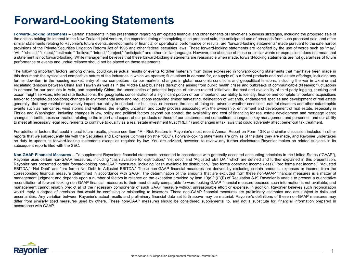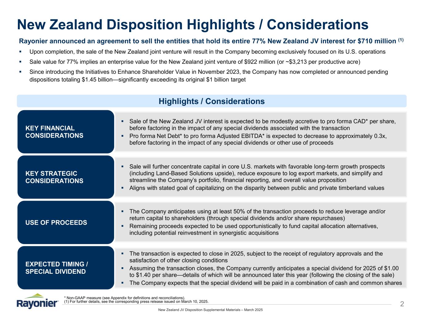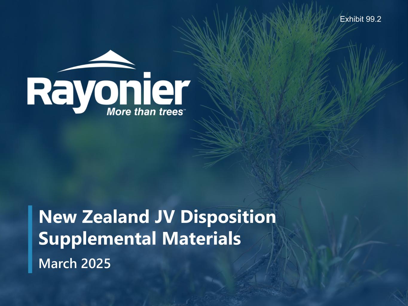 New Zealand JV Disposition Supplemental Materials – March 2025 Forward-Looking Statements 1 Forward-Looking Statements – Certain statements in this presentation regarding anticipated financial and other benefits of Rayonier’s business strategies, including the proposed sale of the entities holding its interest in the New Zealand joint venture, the expected timing of completing such proposed sale, the anticipated use of proceeds from such proposed sale, and other similar statements relating to Rayonier’s future events, developments or financial or operational performance or results, are “forward-looking statements” made pursuant to the safe harbor provisions of the Private Securities Litigation Reform Act of 1995 and other federal securities laws. These forward-looking statements are identified by the use of words such as “may,” “will,” “should,” “expect,” “estimate,” “believe,” “intend,” “project,” “anticipate” and other similar language. However, the absence of these or similar words or expressions does not mean that a statement is not forward-looking. While management believes that these forward-looking statements are reasonable when made, forward-looking statements are not guarantees of future performance or events and undue reliance should not be placed on these statements. The following important factors, among others, could cause actual results or events to differ materially from those expressed in forward-looking statements that may have been made in this document: the cyclical and competitive nature of the industries in which we operate; fluctuations in demand for, or supply of, our forest products and real estate offerings, including any further downturn in the housing market; entry of new competitors into our markets; changes in global economic conditions and geopolitical tensions, including the war in Ukraine and escalating tensions between China and Taiwan as well as in the Middle East; business disruptions arising from public health crises and outbreaks of communicable diseases; fluctuations in demand for our products in Asia, and especially China; the uncertainties of potential impacts of climate-related initiatives; the cost and availability of third-party logging, trucking and ocean freight services; interest rate fluctuations; the geographic concentration of a significant portion of our timberland; our ability to identify, finance and complete timberland acquisitions and/or to complete dispositions; changes in environmental laws and regulations regarding timber harvesting, delineation of wetlands, endangered species and development of real estate generally, that may restrict or adversely impact our ability to conduct our business, or increase the cost of doing so; adverse weather conditions, natural disasters and other catastrophic events such as hurricanes, wind storms and wildfires; the lengthy, uncertain and costly process associated with the ownership, entitlement and development of real estate, especially in Florida and Washington, including changes in law, policy and political factors beyond our control; the availability and cost of financing for real estate development and mortgage loans; changes in tariffs, taxes or treaties relating to the import and export of our products or those of our customers and competitors; changes in key management and personnel; and our ability to meet all necessary legal requirements to continue to qualify as a real estate investment trust (“REIT”) and changes in tax laws that could adversely affect beneficial tax treatment. For additional factors that could impact future results, please see Item 1A - Risk Factors in Rayonier’s most recent Annual Report on Form 10-K and similar discussion included in other reports that we subsequently file with the Securities and Exchange Commission (the “SEC”). Forward-looking statements are only as of the date they are made, and Rayonier undertakes no duty to update its forward-looking statements except as required by law. You are advised, however, to review any further disclosures Rayonier makes on related subjects in its subsequent reports filed with the SEC. Non-GAAP Financial Measures – To supplement Rayonier’s financial statements presented in accordance with generally accepted accounting principles in the United States (“GAAP”), Rayonier uses certain non-GAAP measures, including “cash available for distribution,” “net debt” and “Adjusted EBITDA,” which are defined and further explained in this presentation. Rayonier has presented certain forward-looking non-GAAP measures, including “cash available for distribution,” “pro forma operating income (loss),” “pro forma net income,” “Adjusted EBITDA,” “Net Debt” and “pro forma Net Debt to Adjusted EBITDA.” These non-GAAP financial measures are derived by excluding certain amounts, expenses or income, from the corresponding financial measure determined in accordance with GAAP. The determination of the amounts that are excluded from these non-GAAP financial measures is a matter of management judgment and depends upon a number of factors in reliance on the exception provided by item 10(e)(1)(i)(B) of Regulation S-K. Rayonier is unable to present a quantitative reconciliation of forward-looking non-GAAP financial measures to their most directly comparable forward-looking GAAP financial measure because such information is not available, and management cannot reliably predict all of the necessary components of such GAAP measure without unreasonable effort or expense. In addition, Rayonier believes such reconciliation would imply a degree of precision that would be confusing or misleading to investors. These non-GAAP financial measures are preliminary estimates and are subject to risks and uncertainties. Any variation between Rayonier's actual results and preliminary financial data set forth above may be material. Rayonier’s definitions of these non-GAAP 