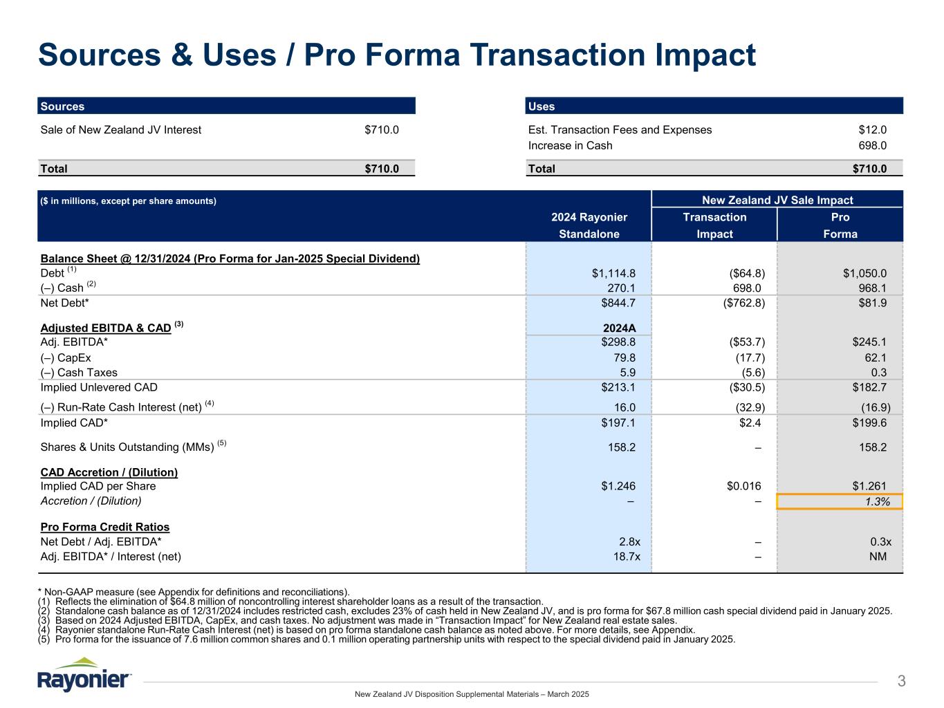 New Zealand JV Disposition Supplemental Materials – March 2025 New Zealand Disposition Highlights / Considerations 2  Sale of the New Zealand JV interest is expected to be modestly accretive to pro forma CAD* per share, before factoring in the impact of any special dividends associated with the transaction  Pro forma Net Debt* to pro forma Adjusted EBITDA* is expected to decrease to approximately 0.3x, before factoring in the impact of any special dividends or other use of proceeds KEY FINANCIAL CONSIDERATIONS  Sale will further concentrate capital in core U.S. markets with favorable long-term growth prospects (including Land-Based Solutions upside), reduce exposure to log export markets, and simplify and streamline the Company’s portfolio, financial reporting, and overall value proposition  Aligns with stated goal of capitalizing on the disparity between public and private timberland values KEY STRATEGIC CONSIDERATIONS  The Company anticipates using at least 50% of the transaction proceeds to reduce leverage and/or return capital to shareholders (through special dividends and/or share repurchases)  Remaining proceeds expected to be used opportunistically to fund capital allocation alternatives, including potential reinvestment in synergistic acquisitions USE OF PROCEEDS  The transaction is expected to close in 2025, subject to the receipt of regulatory approvals and the satisfaction of other closing conditions  Assuming the transaction closes, the Company currently anticipates a special dividend for 2025 of $1.00 to $1.40 per share—details of which will be announced later this year (following the closing of the sale)  The Company expects that the special dividend will be paid in a combination of cash and common shares EXPECTED TIMING / SPECIAL DIVIDEND Rayonier announced an agreement to sell the entities that hold its entire 77% New Zealand JV interest for $710 million (1)  Upon completion, the sale of the New Zealand joint venture will result in the Company becoming exclusively focused on its U.S. operations  Sale value for 77% implies an enterprise value for the New Zealand joint venture of $922 million (or ~$3,213 per productive acre)  Since introducing the Initiatives to Enhance Shareholder Value in November 2023, the Company has now completed or announced pending dispositions totaling $1.45 billion—significantly exceeding its original $1 billion target Highlights / Considerations * Non-GAAP measure (see Appendix for definitions and reconciliations). (1) For further details, see the corresponding press release issued on March 10, 2025.