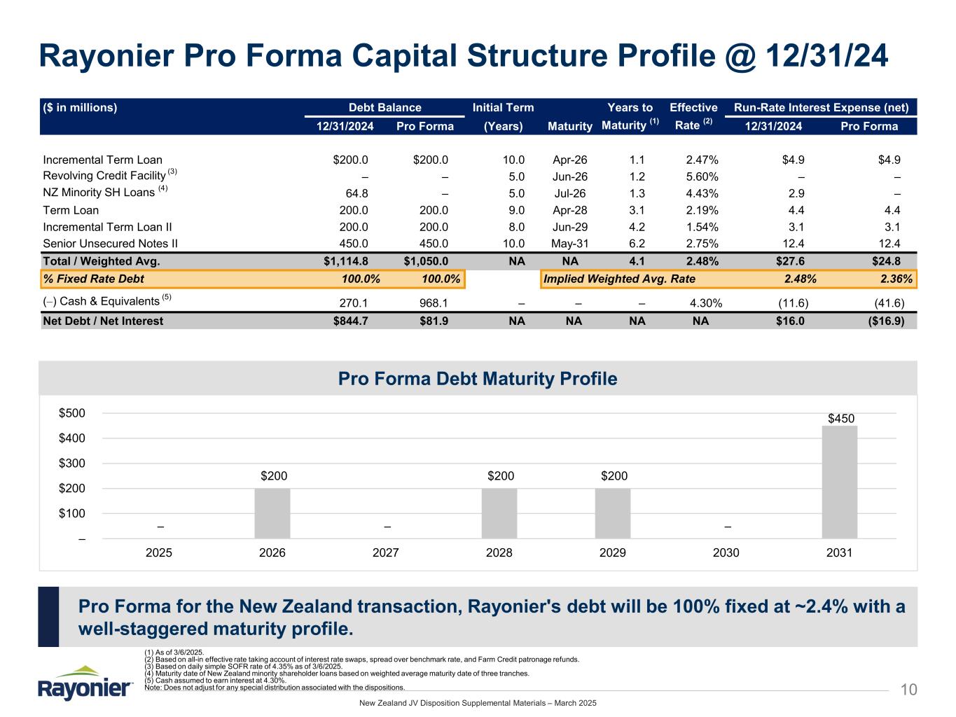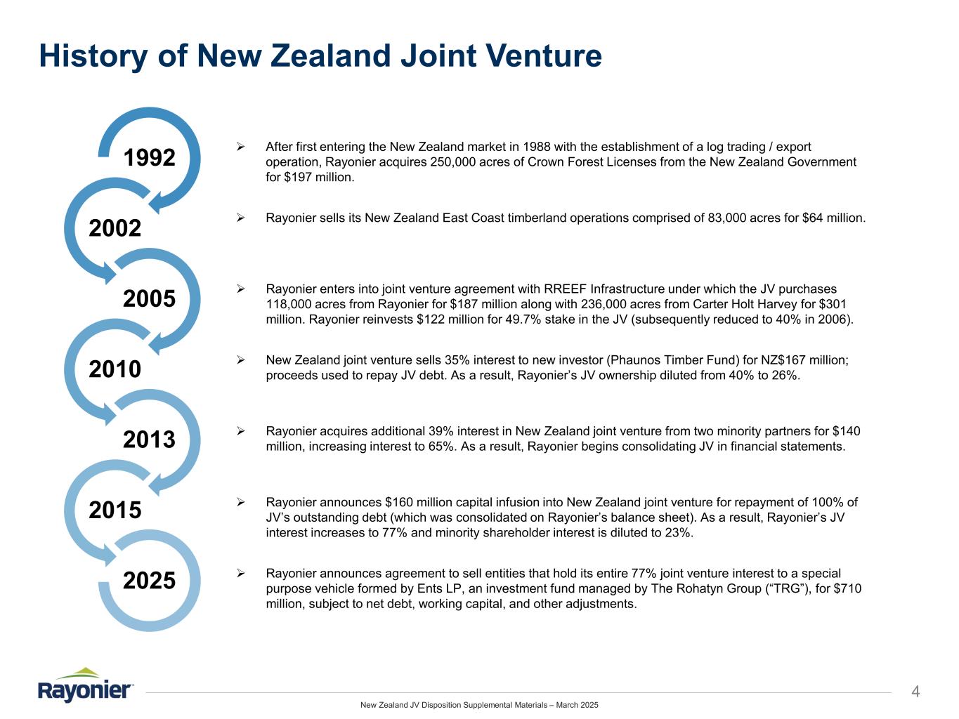New Zealand JV Disposition Supplemental Materials – March 2025 Sources & Uses / Pro Forma Transaction Impact 3 * Non-GAAP measure (see Appendix for definitions and reconciliations). (1) Reflects the elimination of $64.8 million of noncontrolling interest shareholder loans as a result of the transaction. (2) Standalone cash balance as of 12/31/2024 includes restricted cash, excludes 23% of cash held in New Zealand JV, and is pro forma for $67.8 million cash special dividend paid in January 2025. (3) Based on 2024 Adjusted EBITDA, CapEx, and cash taxes. No adjustment was made in “Transaction Impact” for New Zealand real estate sales. (4) Rayonier standalone Run-Rate Cash Interest (net) is based on pro forma standalone cash balance as noted above. For more details, see Appendix. (5) Pro forma for the issuance of 7.6 million common shares and 0.1 million operating partnership units with respect to the special dividend paid in January 2025. Sources Uses Sale of New Zealand JV Interest $710.0 Est. Transaction Fees and Expenses $12.0 Increase in Cash 698.0 Total $710.0 Total $710.0 ($ in millions, except per share amounts) 2024 Rayonier Transaction Pro Standalone Impact Forma Balance Sheet @ 12/31/2024 (Pro Forma for Jan-2025 Special Dividend) Debt (1) $1,114.8 ($64.8) $1,050.0 (–) Cash (2) 270.1 698.0 968.1 Net Debt* $844.7 ($762.8) $81.9 Adjusted EBITDA & CAD (3) 2024A Adj. EBITDA* $298.8 ($53.7) $245.1 (–) CapEx 79.8 (17.7) 62.1 (–) Cash Taxes 5.9 (5.6) 0.3 Implied Unlevered CAD $213.1 ($30.5) $182.7 (–) Run-Rate Cash Interest (net) (4) 16.0 (32.9) (16.9) Implied CAD* $197.1 $2.4 $199.6 Shares & Units Outstanding (MMs) (5) 158.2 – 158.2 CAD Accretion / (Dilution) Implied CAD per Share $1.246 $0.016 $1.261 Accretion / (Dilution) – – 1.3% Pro Forma Credit Ratios Net Debt / Adj. EBITDA* 2.8x – 0.3x Adj. EBITDA* / Interest (net) 18.7x – NM New Zealand JV Sale Impact