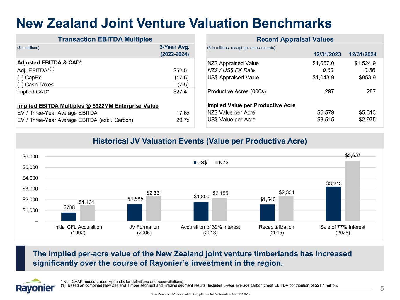 New Zealand JV Disposition Supplemental Materials – March 2025 History of New Zealand Joint Venture 4 1992 2002 2005 2010 2013 2015 2025  After first entering the New Zealand market in 1988 with the establishment of a log trading / export operation, Rayonier acquires 250,000 acres of Crown Forest Licenses from the New Zealand Government for $197 million.  Rayonier sells its New Zealand East Coast timberland operations comprised of 83,000 acres for $64 million.  Rayonier enters into joint venture agreement with RREEF Infrastructure under which the JV purchases 118,000 acres from Rayonier for $187 million along with 236,000 acres from Carter Holt Harvey for $301 million. Rayonier reinvests $122 million for 49.7% stake in the JV (subsequently reduced to 40% in 2006).  Rayonier acquires additional 39% interest in New Zealand joint venture from two minority partners for $140 million, increasing interest to 65%. As a result, Rayonier begins consolidating JV in financial statements.  Rayonier announces $160 million capital infusion into New Zealand joint venture for repayment of 100% of JV’s outstanding debt (which was consolidated on Rayonier’s balance sheet). As a result, Rayonier’s JV interest increases to 77% and minority shareholder interest is diluted to 23%.  Rayonier announces agreement to sell entities that hold its entire 77% joint venture interest to a special purpose vehicle formed by Ents LP, an investment fund managed by The Rohatyn Group (“TRG”), for $710 million, subject to net debt, working capital, and other adjustments.  New Zealand joint venture sells 35% interest to new investor (Phaunos Timber Fund) for NZ$167 million; proceeds used to repay JV debt. As a result, Rayonier’s JV ownership diluted from 40% to 26%.