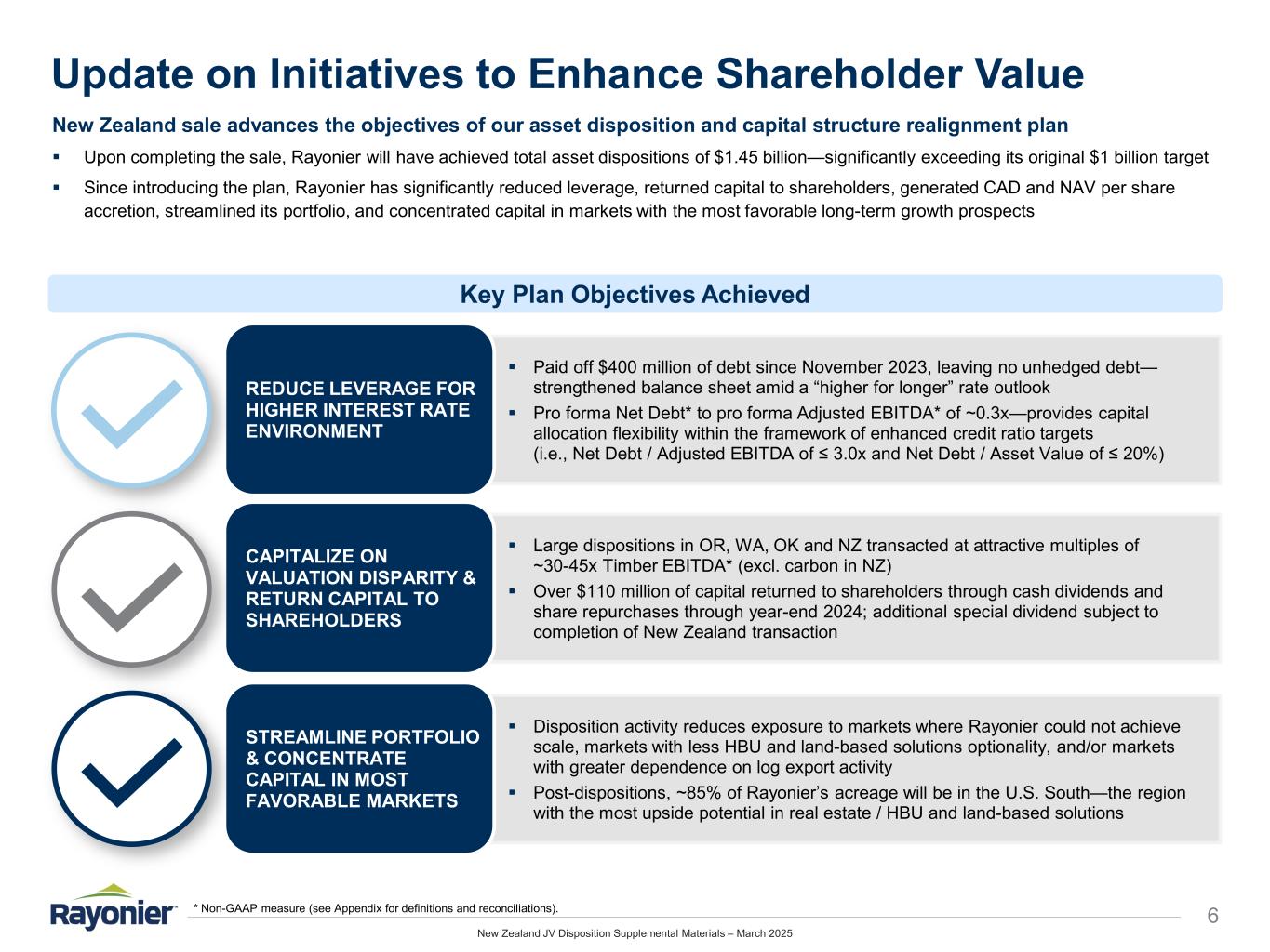 New Zealand JV Disposition Supplemental Materials – March 2025 New Zealand Joint Venture Valuation Benchmarks 5 The implied per-acre value of the New Zealand joint venture timberlands has increased significantly over the course of Rayonier’s investment in the region. * Non-GAAP measure (see Appendix for definitions and reconciliations). (1) Based on combined New Zealand Timber segment and Trading segment results. Includes 3-year average carbon credit EBITDA contribution of $21.4 million. Historical JV Valuation Events (Value per Productive Acre) Transaction EBITDA Multiples ($ in millions) 3-Year Avg. (2022-2024) Adjusted EBITDA & CAD* Adj. EBITDA*(1) $52.5 (–) CapEx (17.6) (–) Cash Taxes (7.5) Implied CAD* $27.4 Implied EBITDA Multiples @ $922MM Enterprise Value EV / Three-Year Average EBITDA 17.6x EV / Three-Year Average EBITDA (excl. Carbon) 29.7x Recent Appraisal Values ($ in millions, except per acre amounts) 12/31/2023 12/31/2024 NZ$ Appraised Value $1,657.0 $1,524.9 NZ$ / US$ FX Rate 0.63 0.56 US$ Appraised Value $1,043.9 $853.9 Productive Acres (000s) 297 287 Implied Value per Productive Acre NZ$ Value per Acre $5,579 $5,313 US$ Value per Acre $3,515 $2,975 $788 $1,585 $1,800 $1,540 $3,213 $1,464 $2,331 $2,155 $2,334 $5,637 – $1,000 $2,000 $3,000 $4,000 $5,000 $6,000 Initial CFL Acquisition (1992) JV Formation (2005) Acquisition of 39% Interest (2013) Recapitalization (2015) Sale of 77% Interest (2025) US$ NZ$