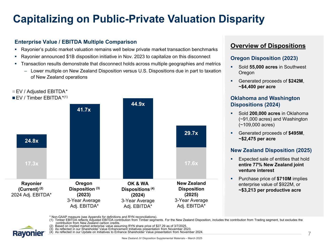 New Zealand JV Disposition Supplemental Materials – March 2025 Update on Initiatives to Enhance Shareholder Value 6* Non-GAAP measure (see Appendix for definitions and reconciliations). New Zealand sale advances the objectives of our asset disposition and capital structure realignment plan  Upon completing the sale, Rayonier will have achieved total asset dispositions of $1.45 billion—significantly exceeding its original $1 billion target  Since introducing the plan, Rayonier has significantly reduced leverage, returned capital to shareholders, generated CAD and NAV per share accretion, streamlined its portfolio, and concentrated capital in markets with the most favorable long-term growth prospects  Paid off $400 million of debt since November 2023, leaving no unhedged debt— strengthened balance sheet amid a “higher for longer” rate outlook  Pro forma Net Debt* to pro forma Adjusted EBITDA* of ~0.3x—provides capital allocation flexibility within the framework of enhanced credit ratio targets (i.e., Net Debt / Adjusted EBITDA of ≤ 3.0x and Net Debt / Asset Value of ≤ 20%) REDUCE LEVERAGE FOR HIGHER INTEREST RATE ENVIRONMENT  Large dispositions in OR, WA, OK and NZ transacted at attractive multiples of ~30-45x Timber EBITDA* (excl. carbon in NZ)  Over $110 million of capital returned to shareholders through cash dividends and share repurchases through year-end 2024; additional special dividend subject to completion of New Zealand transaction CAPITALIZE ON VALUATION DISPARITY & RETURN CAPITAL TO SHAREHOLDERS  Disposition activity reduces exposure to markets where Rayonier could not achieve scale, markets with less HBU and land-based solutions optionality, and/or markets with greater dependence on log export activity  Post-dispositions, ~85% of Rayonier’s acreage will be in the U.S. South—the region with the most upside potential in real estate / HBU and land-based solutions STREAMLINE PORTFOLIO & CONCENTRATE CAPITAL IN MOST FAVORABLE MARKETS Key Plan Objectives Achieved