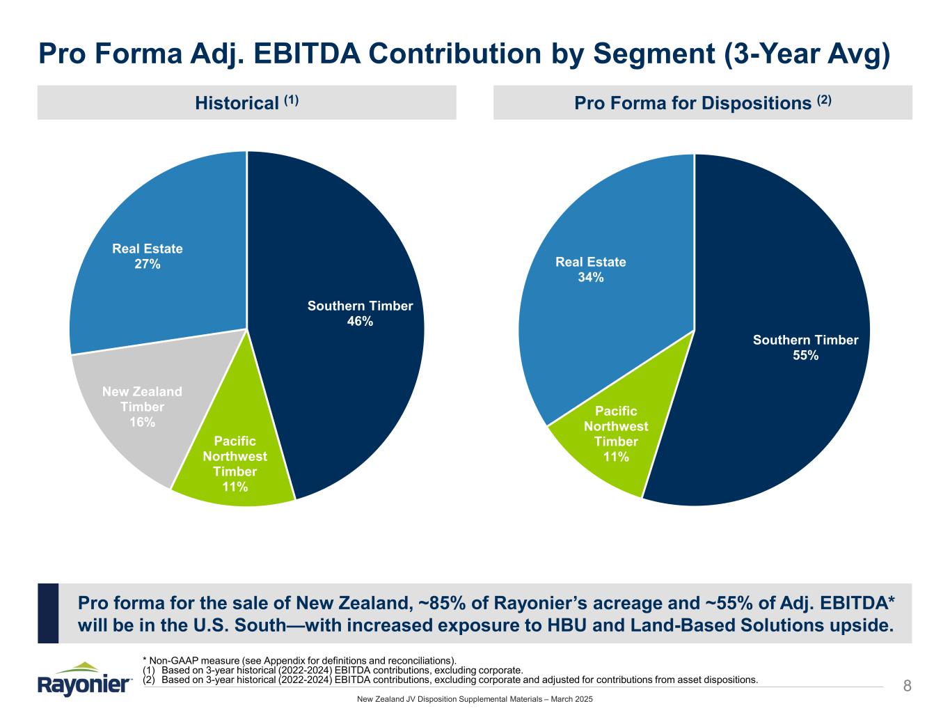 New Zealand JV Disposition Supplemental Materials – March 2025 Capitalizing on Public-Private Valuation Disparity 7 * Non-GAAP measure (see Appendix for definitions and RYN reconciliations). (1) Timber EBITDA reflects Adjusted EBITDA contribution from Timber segments. For the New Zealand Disposition, includes the contribution from Trading segment, but excludes the contribution from New Zealand carbon credits. (2) Based on implied market enterprise value assuming RYN share price of $27.29 as of 3/7/2025. (3) As reflected in our Shareholder Value Enhancement Initiatives presentation from November 2023. (4) As reflected in our Update on Initiatives to Enhance Shareholder Value presentation from November 2024. Enterprise Value / EBITDA Multiple Comparison  Rayonier’s public market valuation remains well below private market transaction benchmarks  Rayonier announced $1B disposition initiative in Nov. 2023 to capitalize on this disconnect  Transaction results demonstrate that disconnect holds across multiple geographies and metrics – Lower multiple on New Zealand Disposition versus U.S. Dispositions due in part to taxation of New Zealand operations Overview of Dispositions Oregon Disposition (2023)  Sold 55,000 acres in Southwest Oregon  Generated proceeds of $242M, ~$4,400 per acre Oklahoma and Washington Dispositions (2024)  Sold 200,000 acres in Oklahoma (~91,000 acres) and Washington (~109,000 acres)  Generated proceeds of $495M, ~$2,475 per acre New Zealand Disposition (2025)  Expected sale of entities that hold entire 77% New Zealand joint venture interest  Purchase price of $710M implies enterprise value of $922M, or ~$3,213 per productive acre 17.3x 17.6x 24.8x 41.7x 44.9x 29.7x EV / Adjusted EBITDA EV / Timber EBITDA Rayonier (Current) (2) 2024 Adj. EBITDA* OK & WA Dispositions (4) (2024) 3-Year Average Adj. EBITDA* New Zealand Disposition (2025) 3-Year Average Adj. EBITDA* Oregon Disposition (3) (2023) 3-Year Average Adj. EBITDA* *(1) *