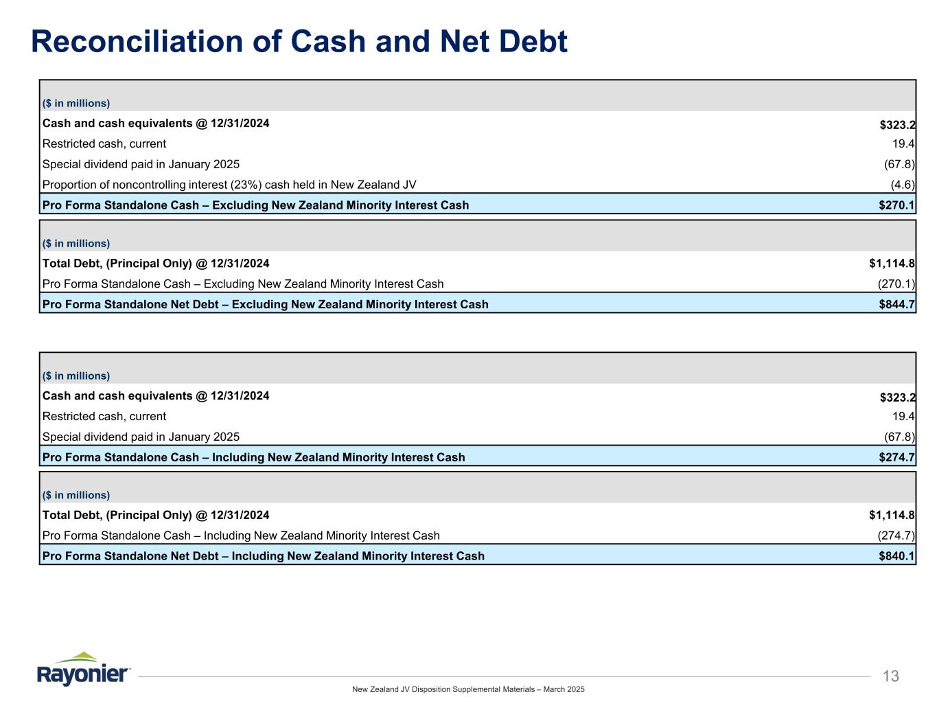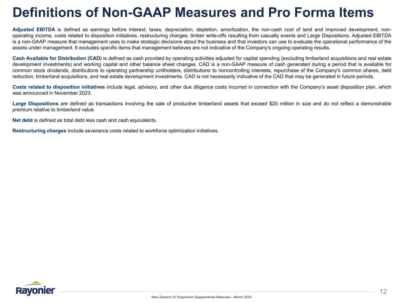 New Zealand JV Disposition Supplemental Materials – March 2025 12 Definitions of Non-GAAP Measures and Pro Forma Items Adjusted EBITDA is defined as earnings before interest, taxes, depreciation, depletion, amortization, the non-cash cost of land and improved development, non- operating income, costs related to disposition initiatives, restructuring charges, timber write-offs resulting from casualty events and Large Dispositions. Adjusted EBITDA is a non-GAAP measure that management uses to make strategic decisions about the business and that investors can use to evaluate the operational performance of the assets under management. It excludes specific items that management believes are not indicative of the Company's ongoing operating results. Cash Available for Distribution (CAD) is defined as cash provided by operating activities adjusted for capital spending (excluding timberland acquisitions and real estate development investments) and working capital and other balance sheet changes. CAD is a non-GAAP measure of cash generated during a period that is available for common stock dividends, distributions to operating partnership unitholders, distributions to noncontrolling interests, repurchase of the Company's common shares, debt reduction, timberland acquisitions, and real estate development investments. CAD is not necessarily indicative of the CAD that may be generated in future periods. Costs related to disposition initiatives include legal, advisory, and other due diligence costs incurred in connection with the Company’s asset disposition plan, which was announced in November 2023. Large Dispositions are defined as transactions involving the sale of productive timberland assets that exceed $20 million in size and do not reflect a demonstrable premium relative to timberland value. Net debt is defined as total debt less cash and cash equivalents. Restructuring charges include severance costs related to workforce optimization initiatives.