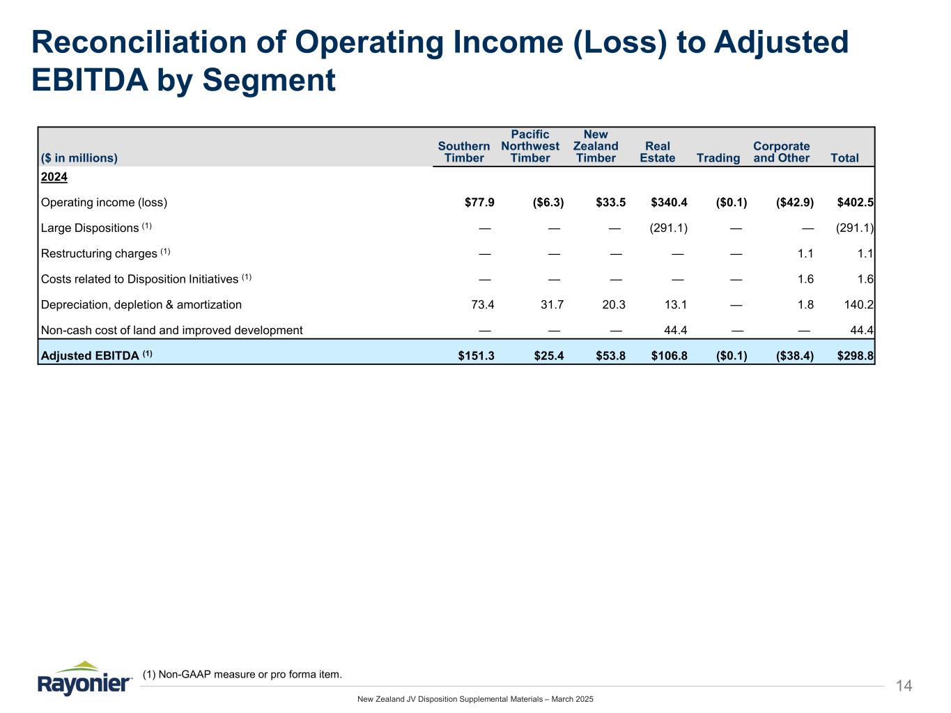 New Zealand JV Disposition Supplemental Materials – March 2025 14 Reconciliation of Operating Income (Loss) to Adjusted EBITDA by Segment (1) Non-GAAP measure or pro forma item. ($ in millions) Southern Timber Pacific Northwest Timber New Zealand Timber Real Estate Trading Corporate and Other Total 2024 Operating income (loss) $77.9 ($6.3) $33.5 $340.4 ($0.1) ($42.9) $402.5 Large Dispositions (1) — — — (291.1) — — (291.1) Restructuring charges (1) — — — — — 1.1 1.1 Costs related to Disposition Initiatives (1) — — — — — 1.6 1.6 Depreciation, depletion & amortization 73.4 31.7 20.3 13.1 — 1.8 140.2 Non-cash cost of land and improved development — — — 44.4 — — 44.4 Adjusted EBITDA (1) $151.3 $25.4 $53.8 $106.8 ($0.1) ($38.4) $298.8