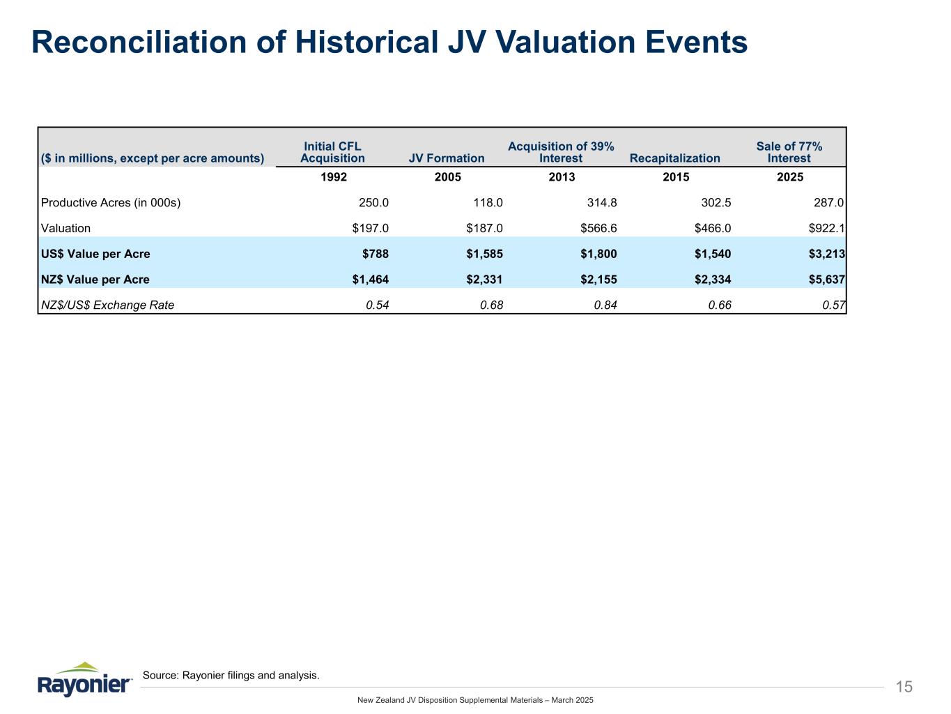 New Zealand JV Disposition Supplemental Materials – March 2025 15 Reconciliation of Historical JV Valuation Events Source: Rayonier filings and analysis. ($ in millions, except per acre amounts) Initial CFL Acquisition JV Formation Acquisition of 39% Interest Recapitalization Sale of 77% Interest 1992 2005 2013 2015 2025 Productive Acres (in 000s) 250.0 118.0 314.8 302.5 287.0 Valuation $197.0 $187.0 $566.6 $466.0 $922.1 US$ Value per Acre $788 $1,585 $1,800 $1,540 $3,213 NZ$ Value per Acre $1,464 $2,331 $2,155 $2,334 $5,637 NZ$/US$ Exchange Rate 0.54 0.68 0.84 0.66 0.57