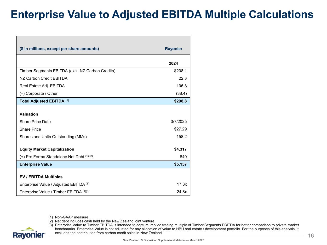 New Zealand JV Disposition Supplemental Materials – March 2025 16 Enterprise Value to Adjusted EBITDA Multiple Calculations (1) Non-GAAP measure. (2) Net debt includes cash held by the New Zealand joint venture. (3) Enterprise Value to Timber EBITDA is intended to capture implied trading multiple of Timber Segments EBITDA for better comparison to private market benchmarks. Enterprise Value is not adjusted for any allocation of value to HBU real estate / development portfolio. For the purposes of this analysis, it excludes the contribution from carbon credit sales in New Zealand. ($ in millions, except per share amounts) Rayonier 2024 Timber Segments EBITDA (excl. NZ Carbon Credits) $208.1 NZ Carbon Credit EBITDA 22.3 Real Estate Adj. EBITDA 106.8 (–) Corporate / Other (38.4) Total Adjusted EBITDA (1) $298.8 Valuation Share Price Date 3/7/2025 Share Price $27.29 Shares and Units Outstanding (MMs) 158.2 Equity Market Capitalization $4,317 (+) Pro Forma Standalone Net Debt (1) (2) 840 Enterprise Value $5,157 EV / EBITDA Multiples Enterprise Value / Adjusted EBITDA (1) 17.3x Enterprise Value / Timber EBITDA (1)(3) 24.8x