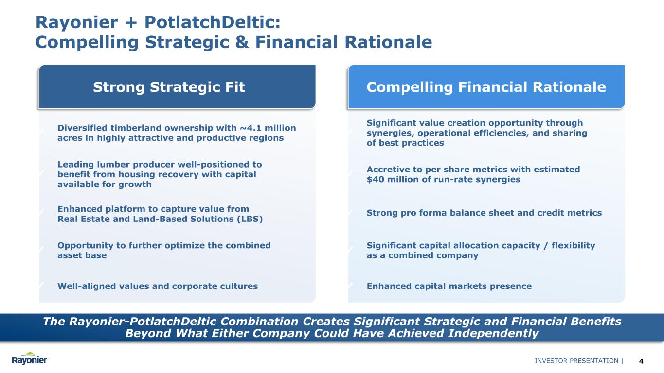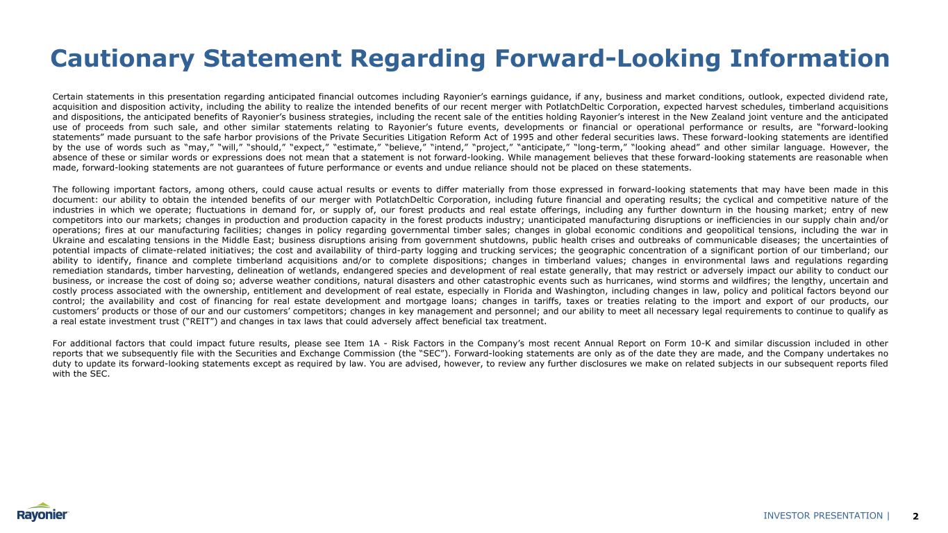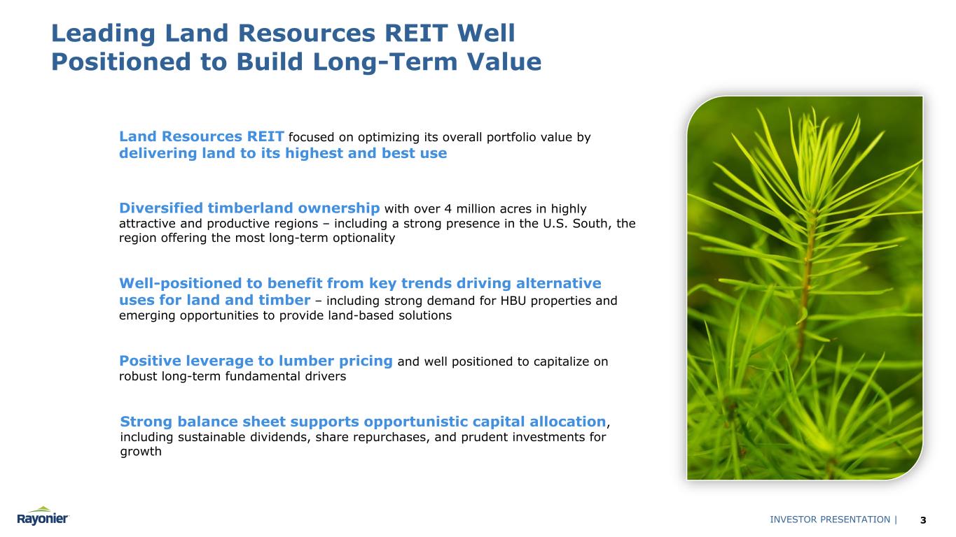 2 Certain statements in this presentation regarding anticipated financial outcomes including Rayonier’s earnings guidance, if any, business and market conditions, outlook, expected dividend rate, acquisition and disposition activity, including the ability to realize the intended benefits of our recent merger with PotlatchDeltic Corporation, expected harvest schedules, timberland acquisitions and dispositions, the anticipated benefits of Rayonier’s business strategies, including the recent sale of the entities holding Rayonier’s interest in the New Zealand joint venture and the anticipated use of proceeds from such sale, and other similar statements relating to Rayonier’s future events, developments or financial or operational performance or results, are “forward-looking statements” made pursuant to the safe harbor provisions of the Private Securities Litigation Reform Act of 1995 and other federal securities laws. These forward-looking statements are identified by the use of words such as “may,” “will,” “should,” “expect,” “estimate,” “believe,” “intend,” “project,” “anticipate,” “long-term,” “looking ahead” and other similar language. However, the absence of these or similar words or expressions does not mean that a statement is not forward-looking. While management believes that these forward-looking statements are reasonable when made, forward-looking statements are not guarantees of future performance or events and undue reliance should not be placed on these statements. The following important factors, among others, could cause actual results or events to differ materially from those expressed in forward-looking statements that may have been made in this document: our ability to obtain the intended benefits of our merger with PotlatchDeltic Corporation, including future financial and operating results; the cyclical and competitive nature of the industries in which we operate; fluctuations in demand for, or supply of, our forest products and real estate offerings, including any further downturn in the housing market; entry of new competitors into our markets; changes in production and production capacity in the forest products industry; unanticipated manufacturing disruptions or inefficiencies in our supply chain and/or operations; fires at our manufacturing facilities; changes in policy regarding governmental timber sales; changes in global economic conditions and geopolitical tensions, including the war in Ukraine and escalating tensions in the Middle East; business disruptions arising from government shutdowns, public health crises and outbreaks of communicable diseases; the uncertainties of potential impacts of climate-related initiatives; the cost and availability of third-party logging and trucking services; the geographic concentration of a significant portion of our timberland; our ability to identify, finance and complete timberland acquisitions and/or to complete dispositions; changes in timberland values; changes in environmental laws and regulations regarding remediation standards, timber harvesting, delineation of wetlands, endangered species and development of real estate generally, that may restrict or adversely impact our ability to conduct our business, or increase the cost of doing so; adverse weather conditions, natural disasters and other catastrophic events such as hurricanes, wind storms and wildfires; the lengthy, uncertain and costly process associated with the ownership, entitlement and development of real estate, especially in Florida and Washington, including changes in law, policy and political factors beyond our control; the availability and cost of financing for real estate development and mortgage loans; changes in tariffs, taxes or treaties relating to the import and export of our products, our customers’ products or those of our and our customers’ competitors; changes in key management and personnel; and our ability to meet all necessary legal requirements to continue to qualify as a real estate investment trust (“REIT”) and changes in tax laws that could adversely affect beneficial tax treatment. For additional factors that could impact future results, please see Item 1A - Risk Factors in the Company’s most recent Annual Report on Form 10-K and similar discussion included in other reports that we subsequently file with the Securities and Exchange Commission (the “SEC”). Forward-looking statements are only as of the date they are made, and the Company undertakes no duty to update its forward-looking statements except as required by law. You are advised, however, to review any further disclosures we make on related subjects in our subsequent reports filed with the SEC. Cautionary Statement Regarding Forward-Looking Information INVESTOR PRESENTATION |