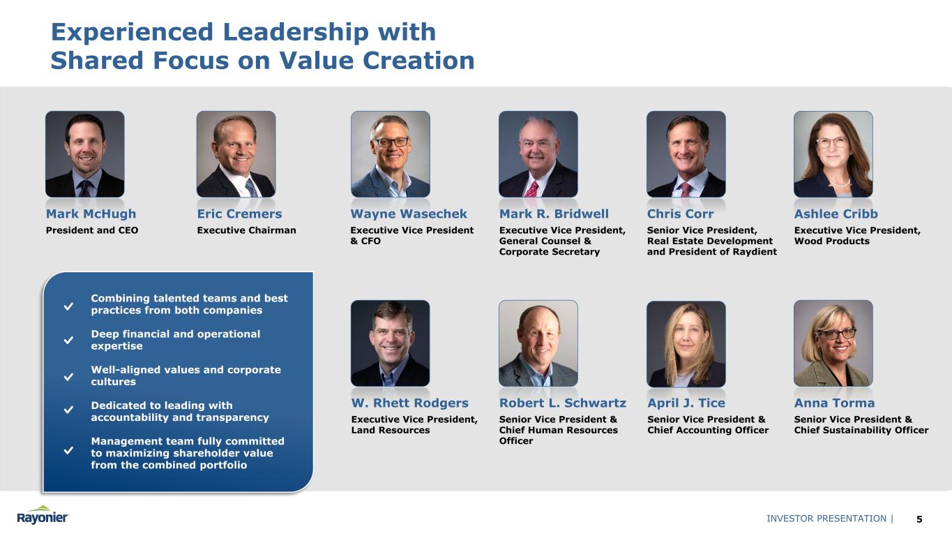 4 Rayonier + PotlatchDeltic: Compelling Strategic & Financial Rationale Strong Strategic Fit The Rayonier-PotlatchDeltic Combination Creates Significant Strategic and Financial Benefits Beyond What Either Company Could Have Achieved Independently Diversified timberland ownership with ~4.1 million acres in highly attractive and productive regions Leading lumber producer well-positioned to benefit from housing recovery with capital available for growth Enhanced platform to capture value from Real Estate and Land-Based Solutions (LBS) Opportunity to further optimize the combined asset base Well-aligned values and corporate cultures Compelling Financial Rationale Significant value creation opportunity through synergies, operational efficiencies, and sharing of best practices Accretive to per share metrics with estimated $40 million of run-rate synergies Strong pro forma balance sheet and credit metrics Significant capital allocation capacity / flexibility as a combined company Enhanced capital markets presence INVESTOR PRESENTATION |