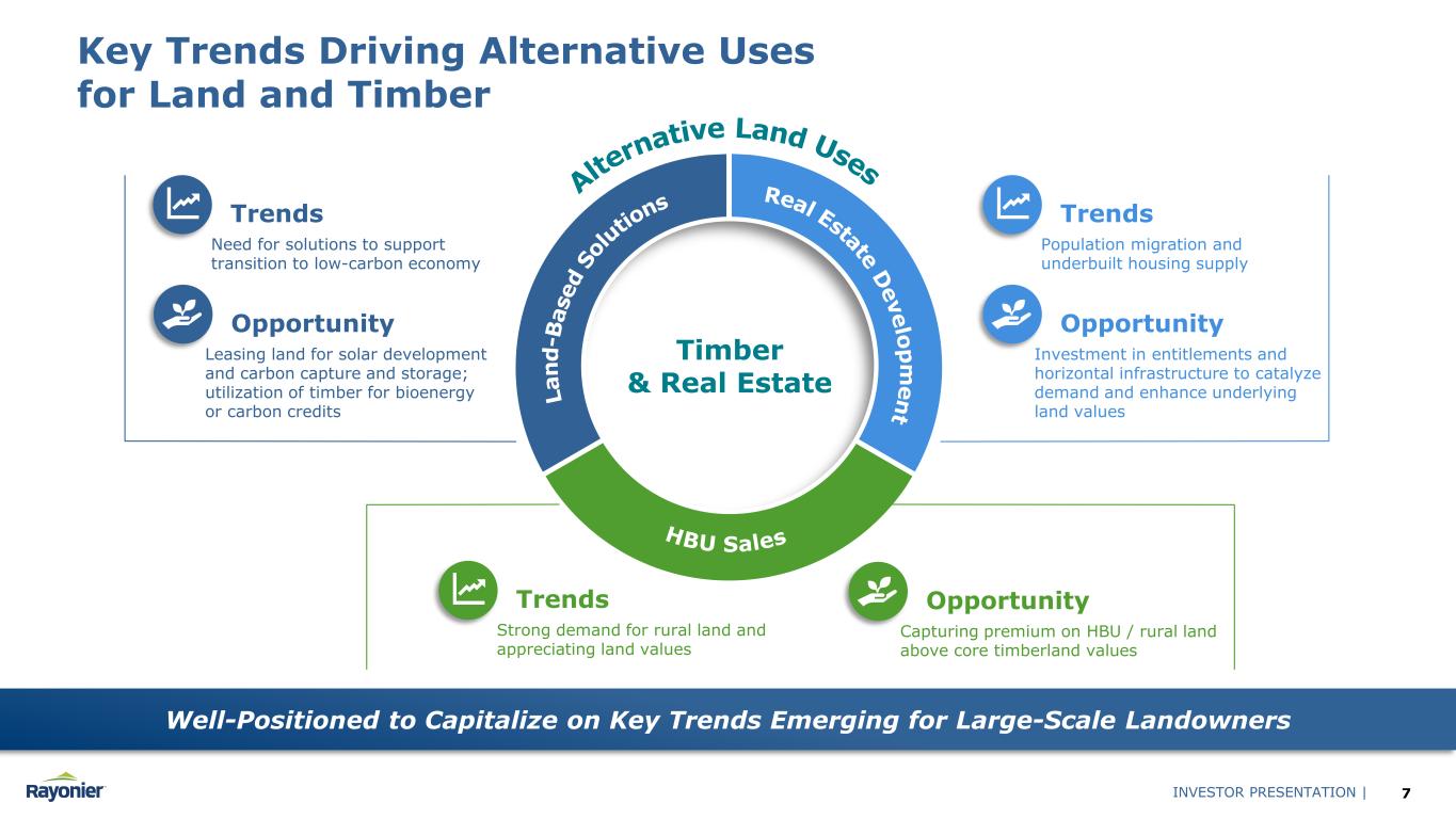 6 Real Estate • Value-add real estate development projects (Chenal Valley, Wildlight, & Heartwood) • Significant presence in regions well-positioned to generate rural HBU premiums Timberlands • Combined portfolio comprising ~4.1MM acres • ~3.2MM acres in the U.S. South, largely concentrated in top-tier timber regions • Majority of Northwest presence in Idaho, where ~75% of sawlogs are indexed to lumber prices Wood Products • Six sawmills with capacity to produce ~1.2BBF (1) of lumber annually • One plywood facility with capacity to produce 150MMSF (1) of plywood annually, focused on industrial applications Land-Based Solutions • 77% of portfolio in the U.S. South, the region best poised for LBS upside • Solar options = 80K acres • CCS leases = 154K acres Idaho 623K Oregon 6K Washington 301K U.S. Northwest Acreage: 930K Acres Alabama 387K Arkansas 938K Florida 346K Georgia 850K Louisiana 175K Mississippi 131K South Carolina 66K Texas 275K U.S. South Acreage: 3,169K Acres Note: Portfolio acres as of December 31, 2025. LBS metrics as of February 2026. 1. BBF stands for billion board feet; MMSF stands for million square feet, 3/8-inch panel thickness basis. Attractive and Diversified Asset Base INVESTOR PRESENTATION |